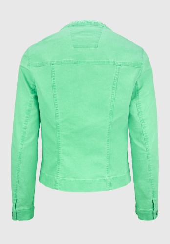 На сайте указаны российские размеры. Джинсовая куртка с особым воротником с бахромой. Благодаря сочетанию высококачественных материалов с эластичным эластаном, она очень удобна в носке и повторяет каждое движение. Планка на пуговицах спереди и особый воротник с бахромой, а также накладные нагрудные карманы делают эту модель абсолютно привлекательной. Длина в размере 44 около 54 см.