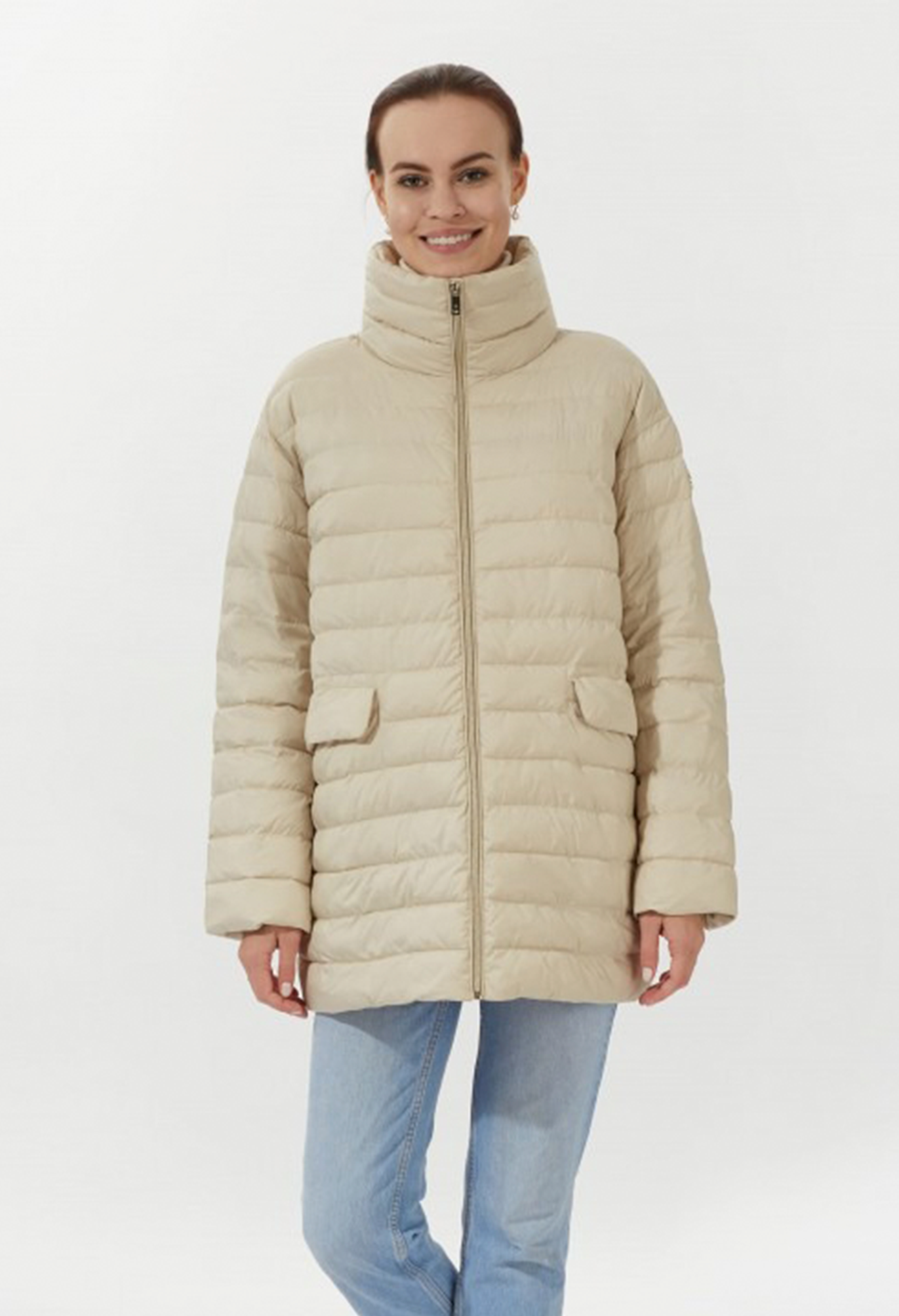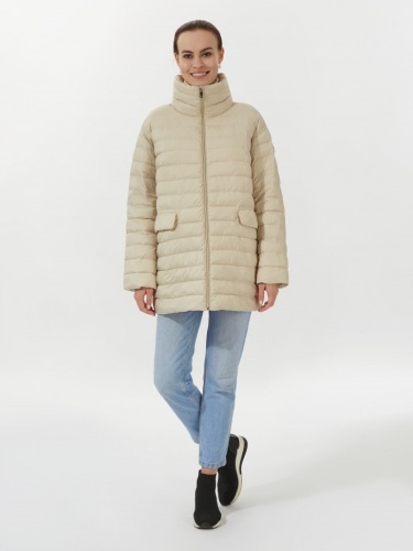 Куртка женская на синтетическом пуху. Выполнена из водоотталкивающей ткани микрофибра. Застежка по борту на молнии, карман листочка отделан клапаном. Высокий воротник стойка.