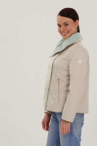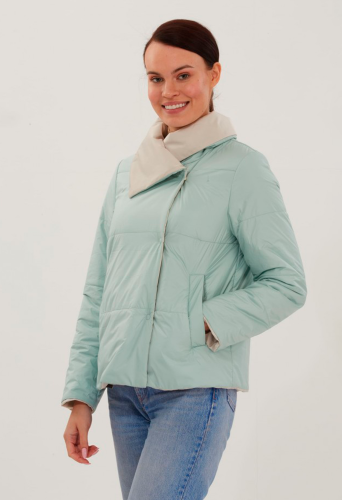 Куртка женская укороченная и двусторонняя на утеплителе. Выполнена из водоотталкивающей ткани . Одна сторона - матовый сатин, вторая - микрофибра. Застежка по борту на кнопках, карманы на молниях и листочка. Объемный отложной воротник.