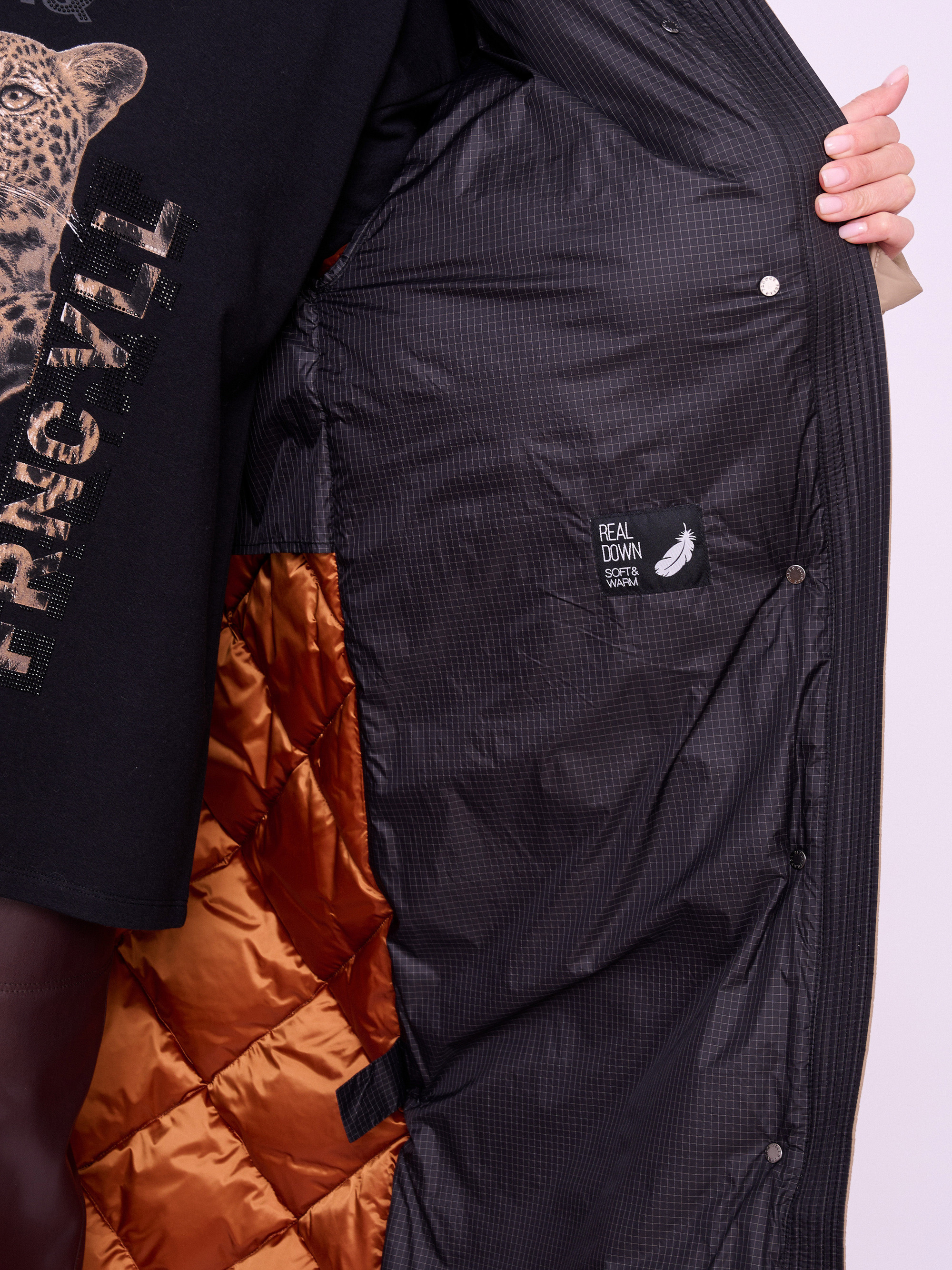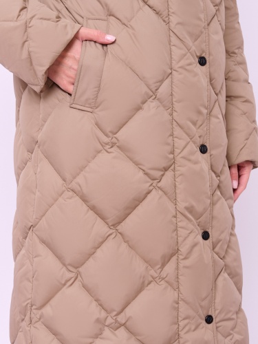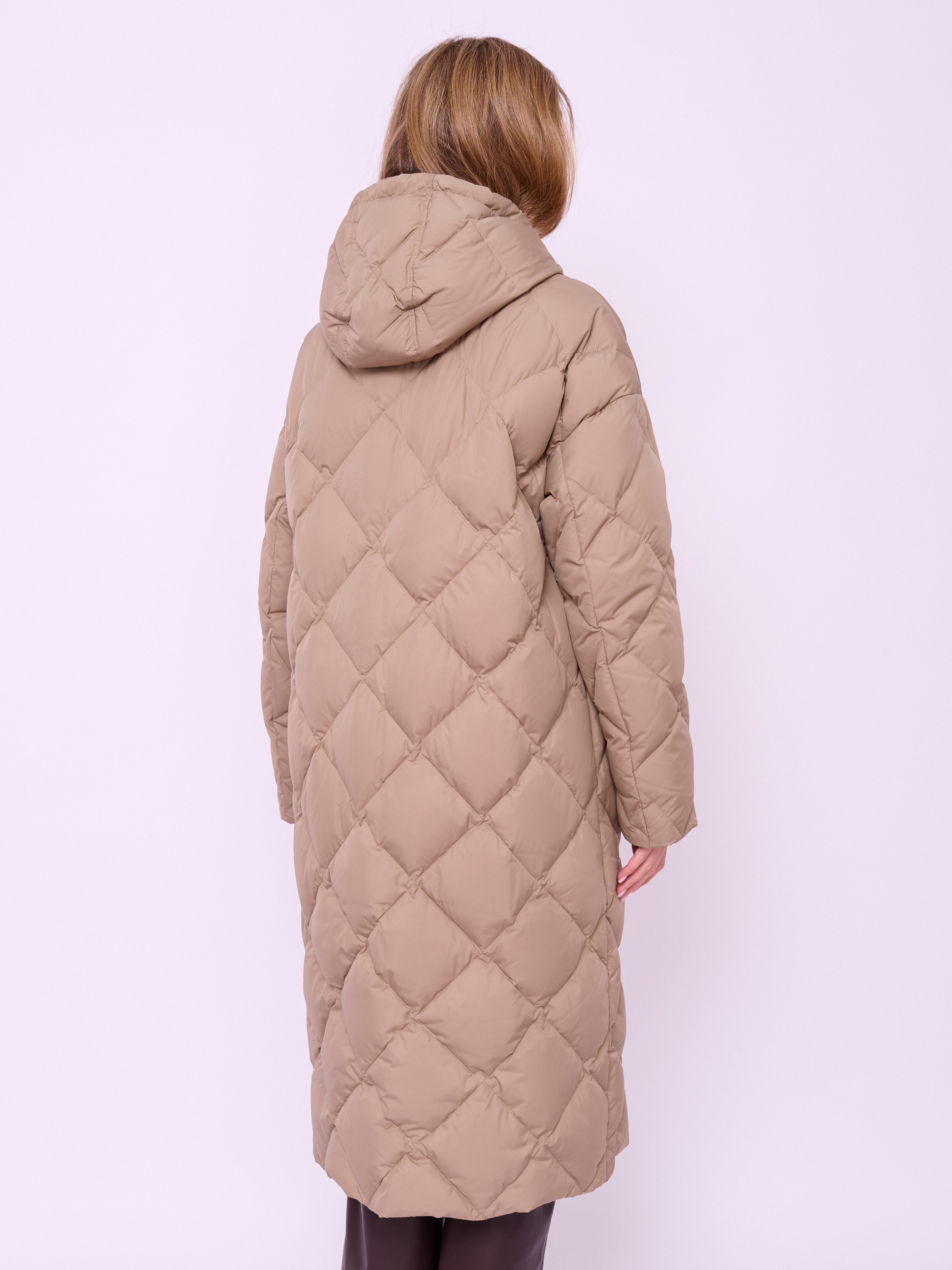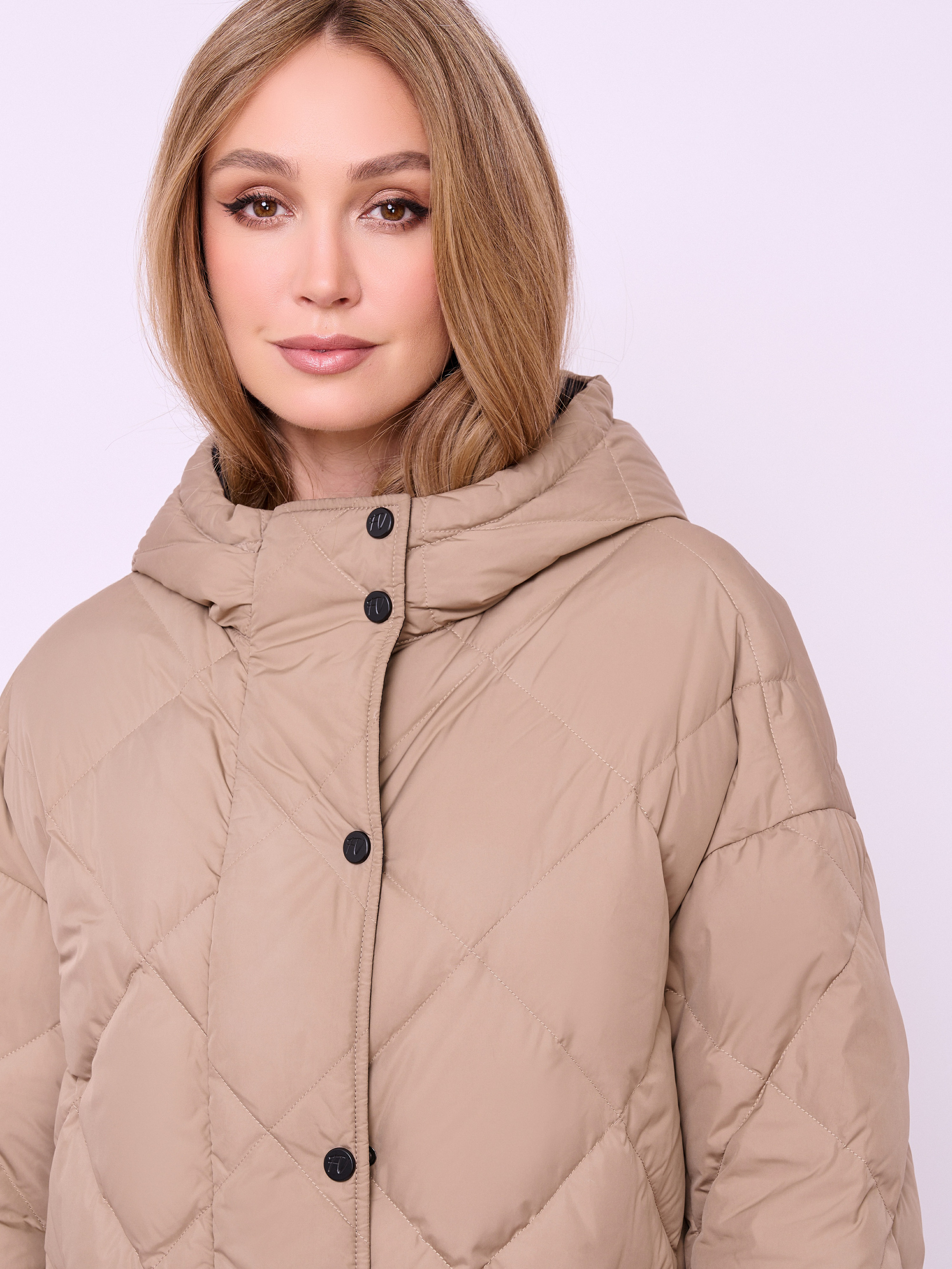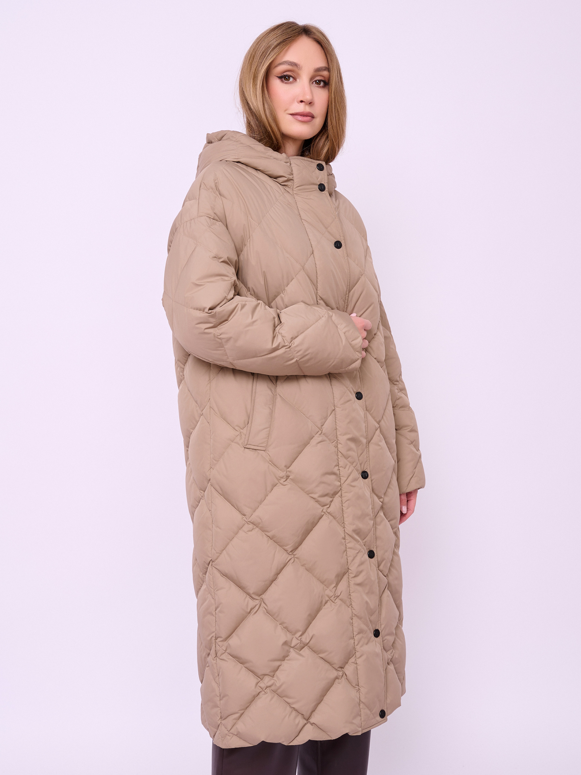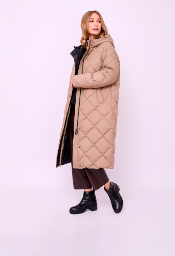 Пальто утепленное стеганое на молнии и кнопках с несъемным капюшоном на кулиске, без опушки, с длинными рукавами с трикотажными манжетами, прорезными карманами. Длина по спине: 112 см.