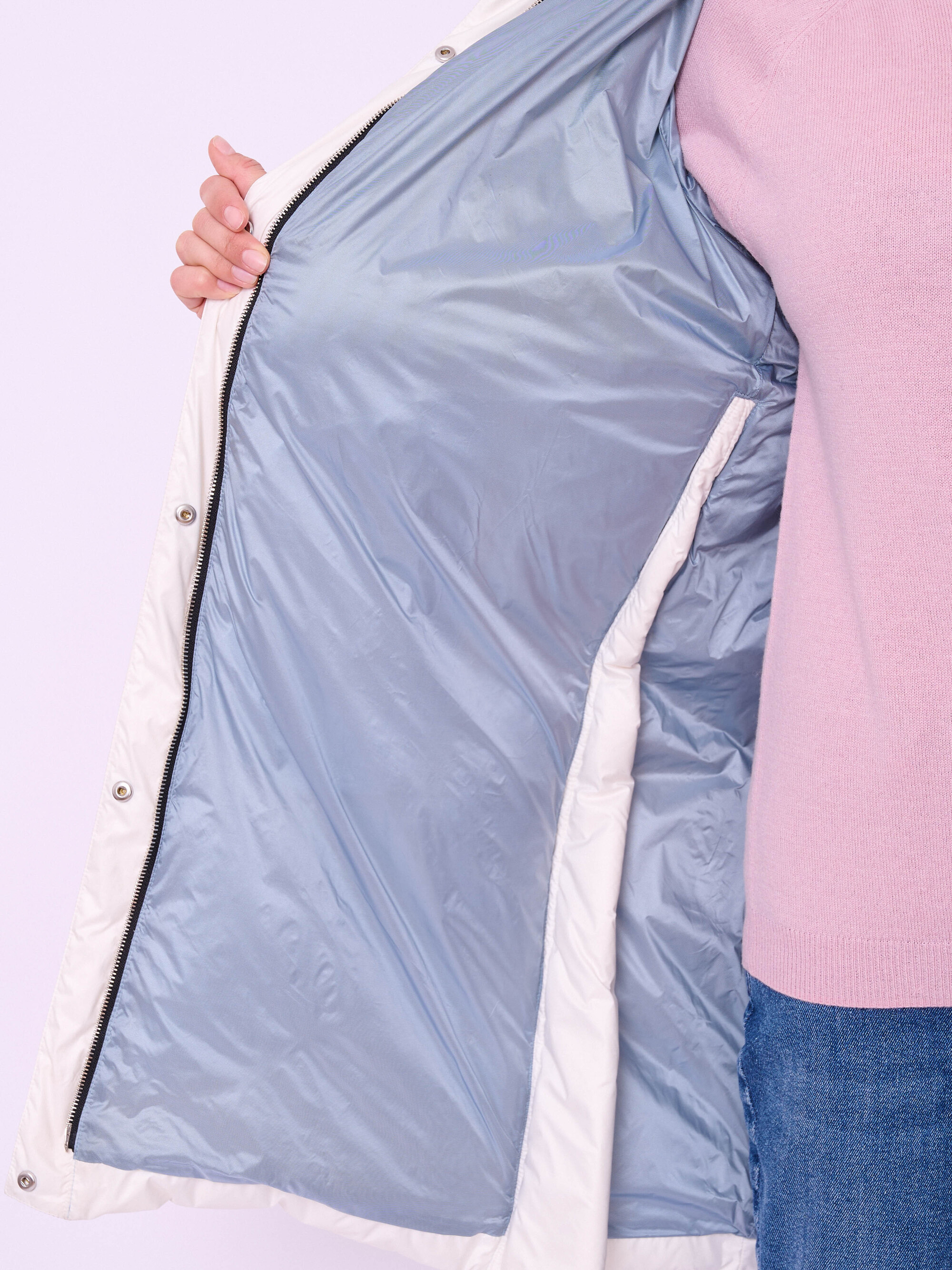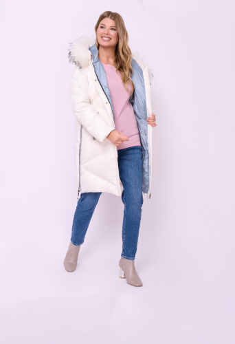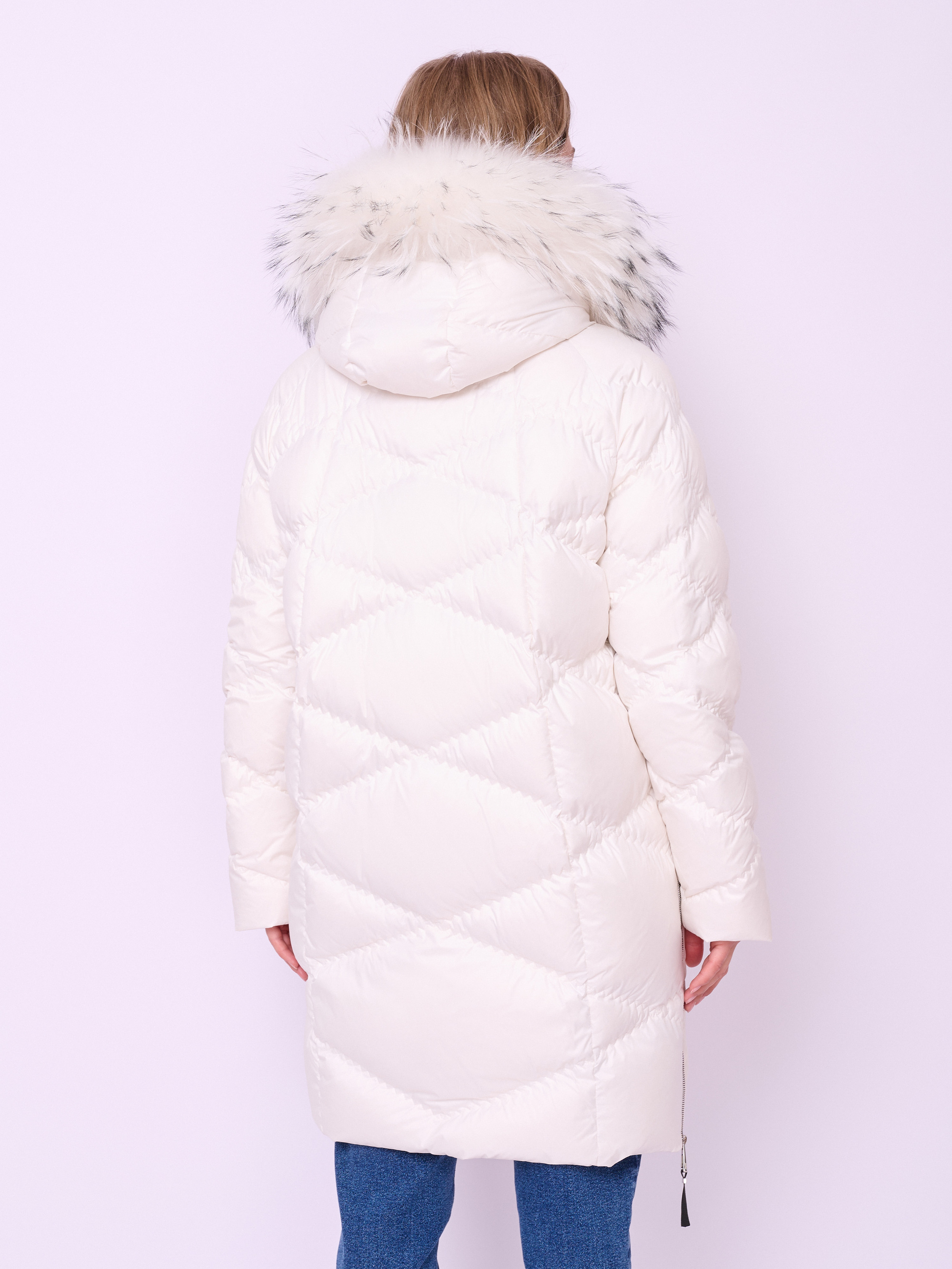 Стеганая куртка-пуховик на молнии и кнопках с высоким воротом, несъемным капюшоном со съемной опушкой из меха енота, длинными рукавами-реглан, прорезными карманами на молнии и высокими боковыми разрезами на молнии. Длина по спинке: 92 см.
