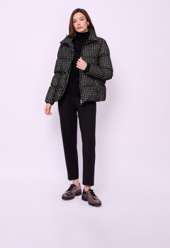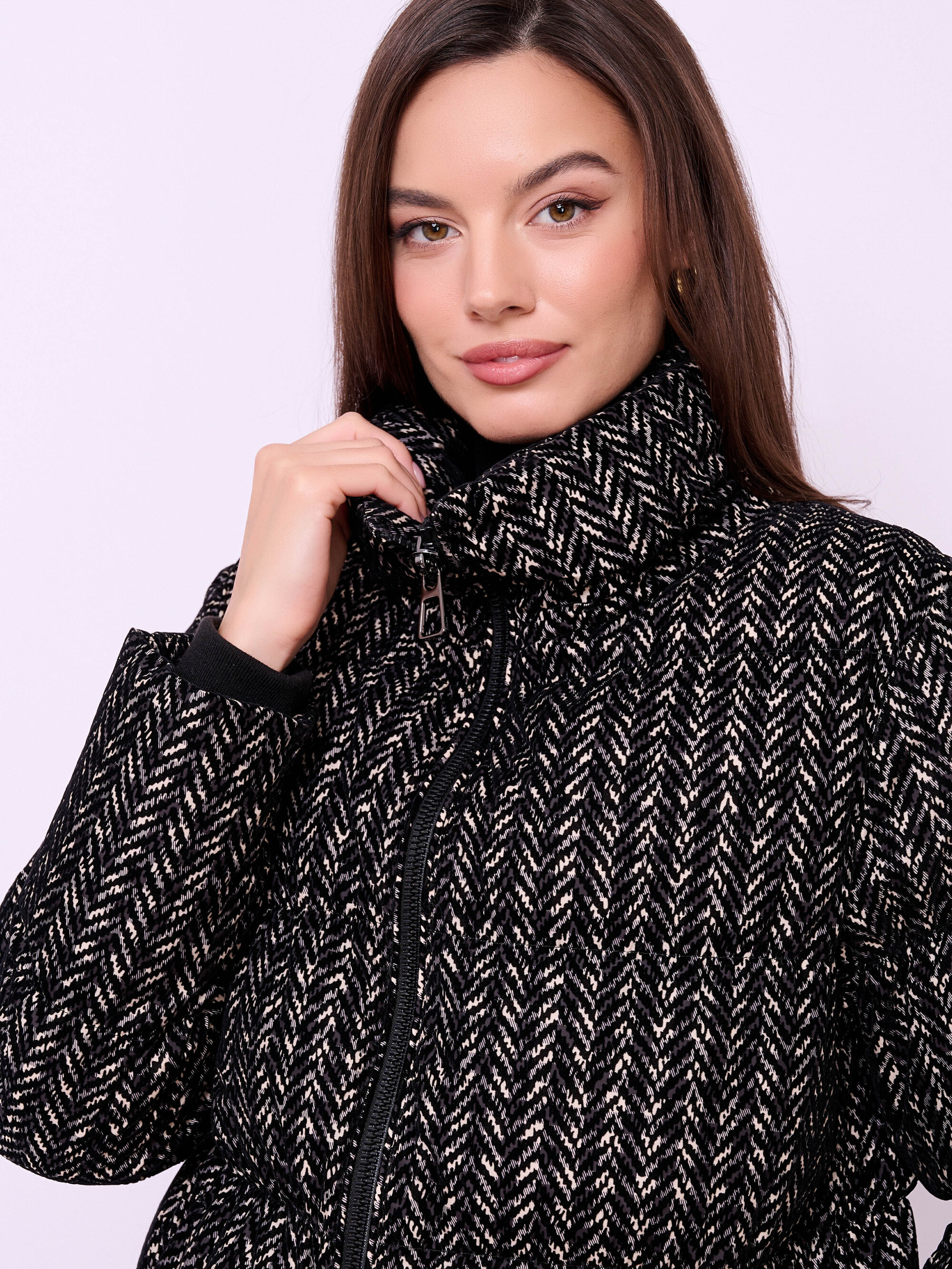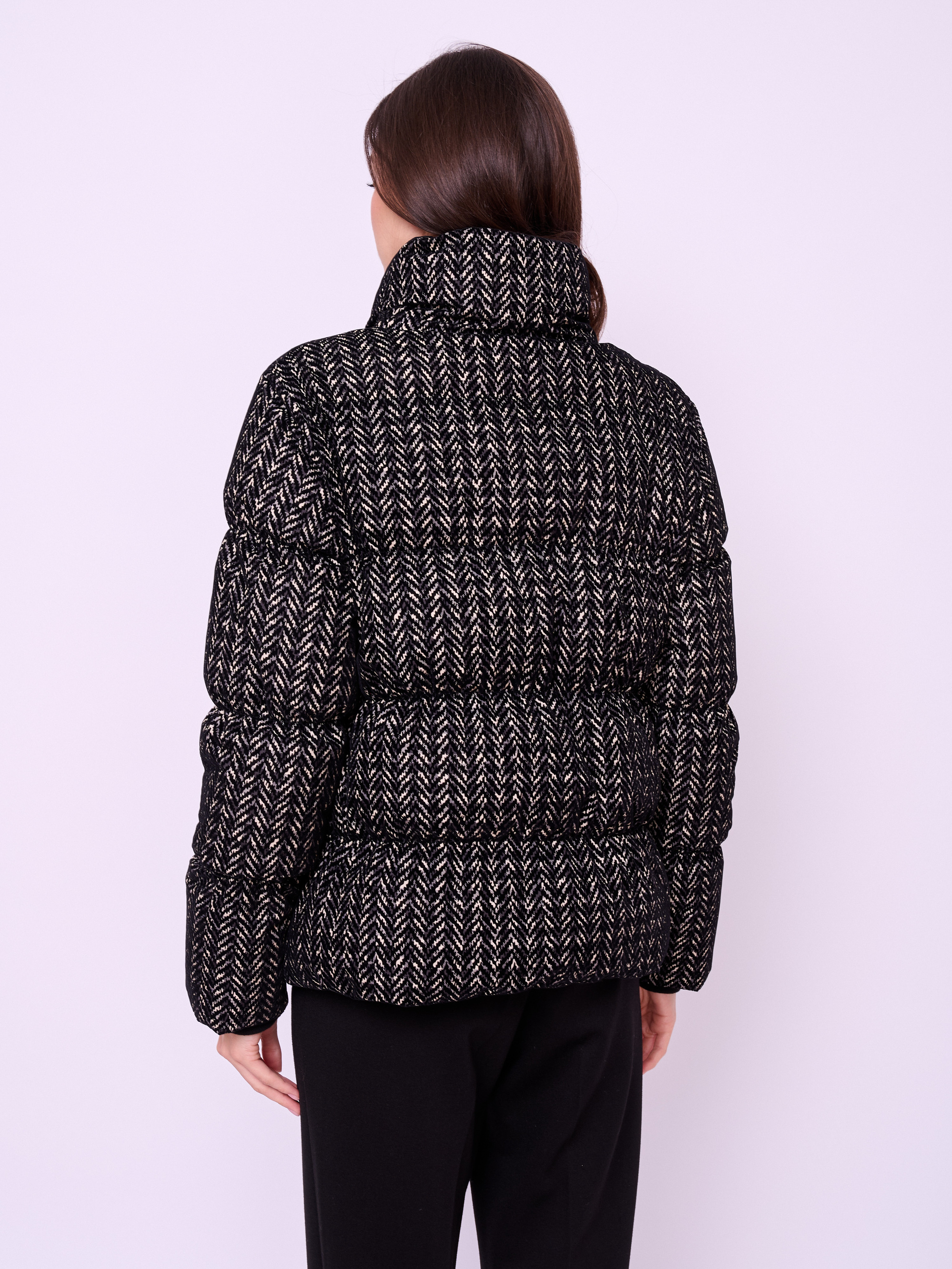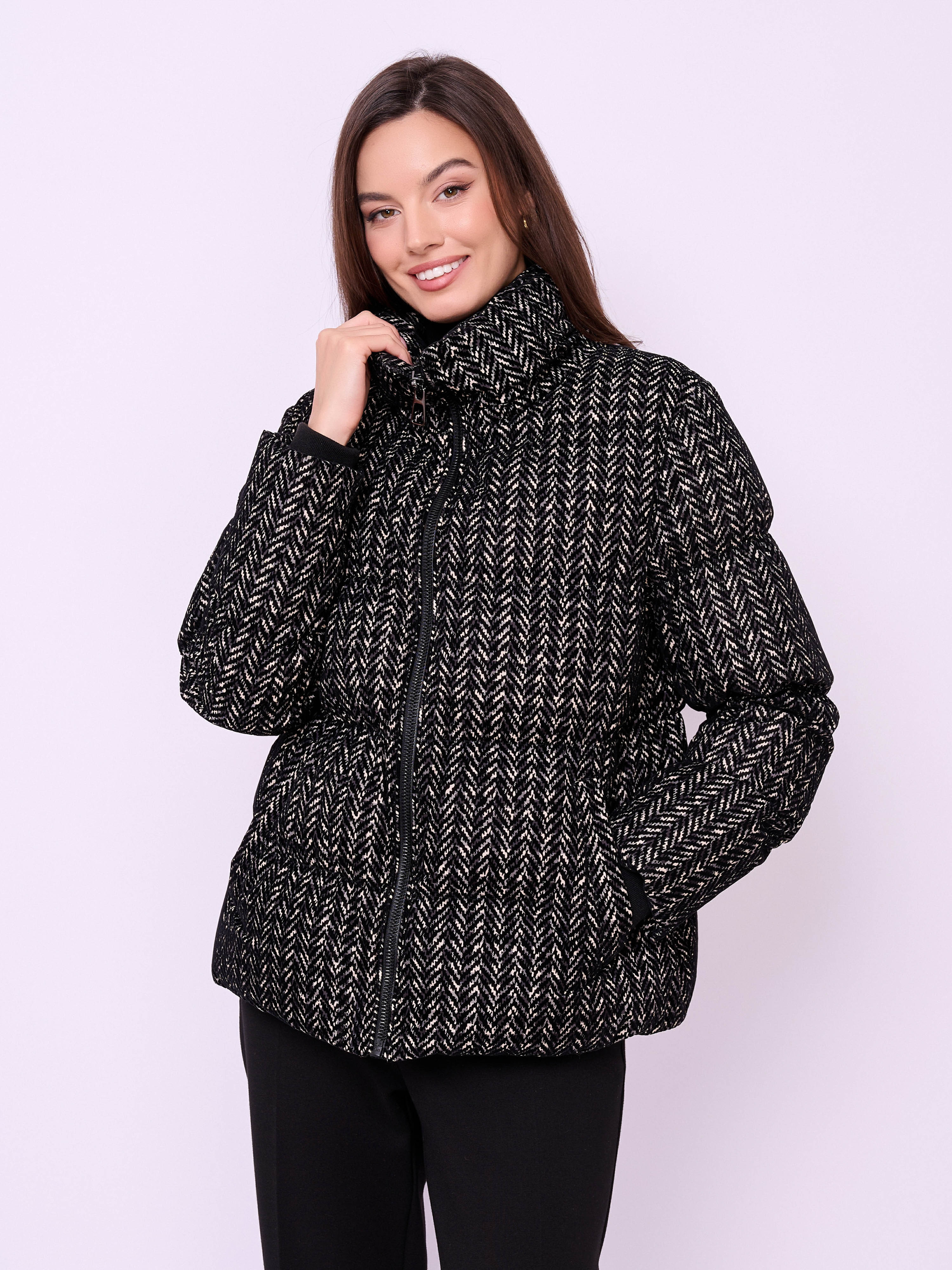 Утепленная куртка из фактурной ткани на молнии с высоким воротом, без капюшона, с длинными рукавами с трикотажными манжетами, прорезными карманами и кулиской по низу изделия.