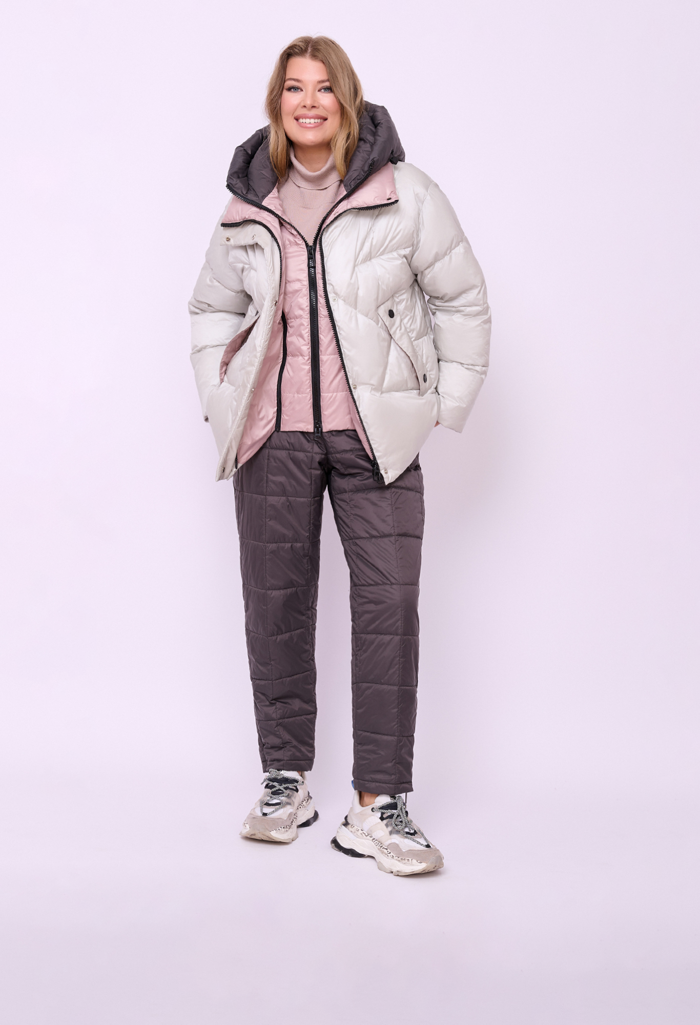 Куртка утпеленная стеганая на молнии и кнопках со съемной манишкой с капюшоном на кулиске, без опушки, с длинными рукавами с трикотажными манжетами, прорезными карманами на кнопках и кулиской по низу.
