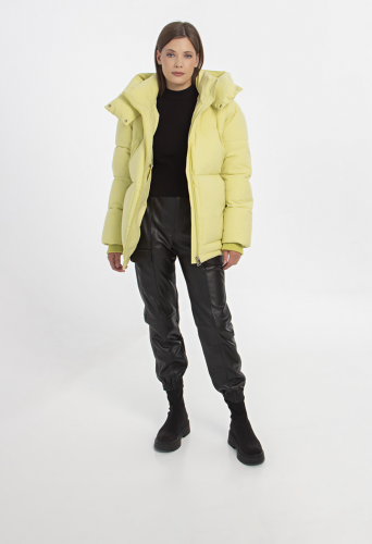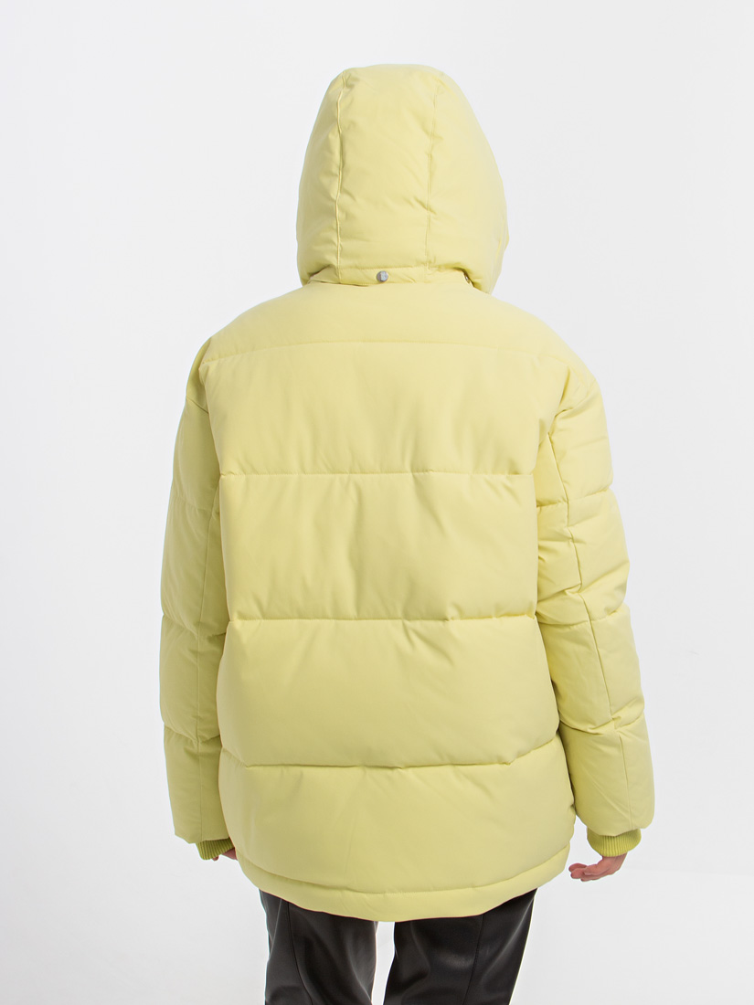 Для пошива яркого стеганого пуховика использовали плотную матовую ткань с внутренней пропиткой, которая не промокает и не продувается ветром. Дополнительную защиту от ветра обеспечивают глубокий съемный капюшон и регулируемая эластичная кулиска понизу, вязаные манжеты. Большие накладные карманы – тренд сезона, на левом кармане тканная эмблема с логотипом. Куртка силуэта оверсайз,для тех кто любит свободу движений. Длина: 73 см. Утеплитель: 280 грамм/м2