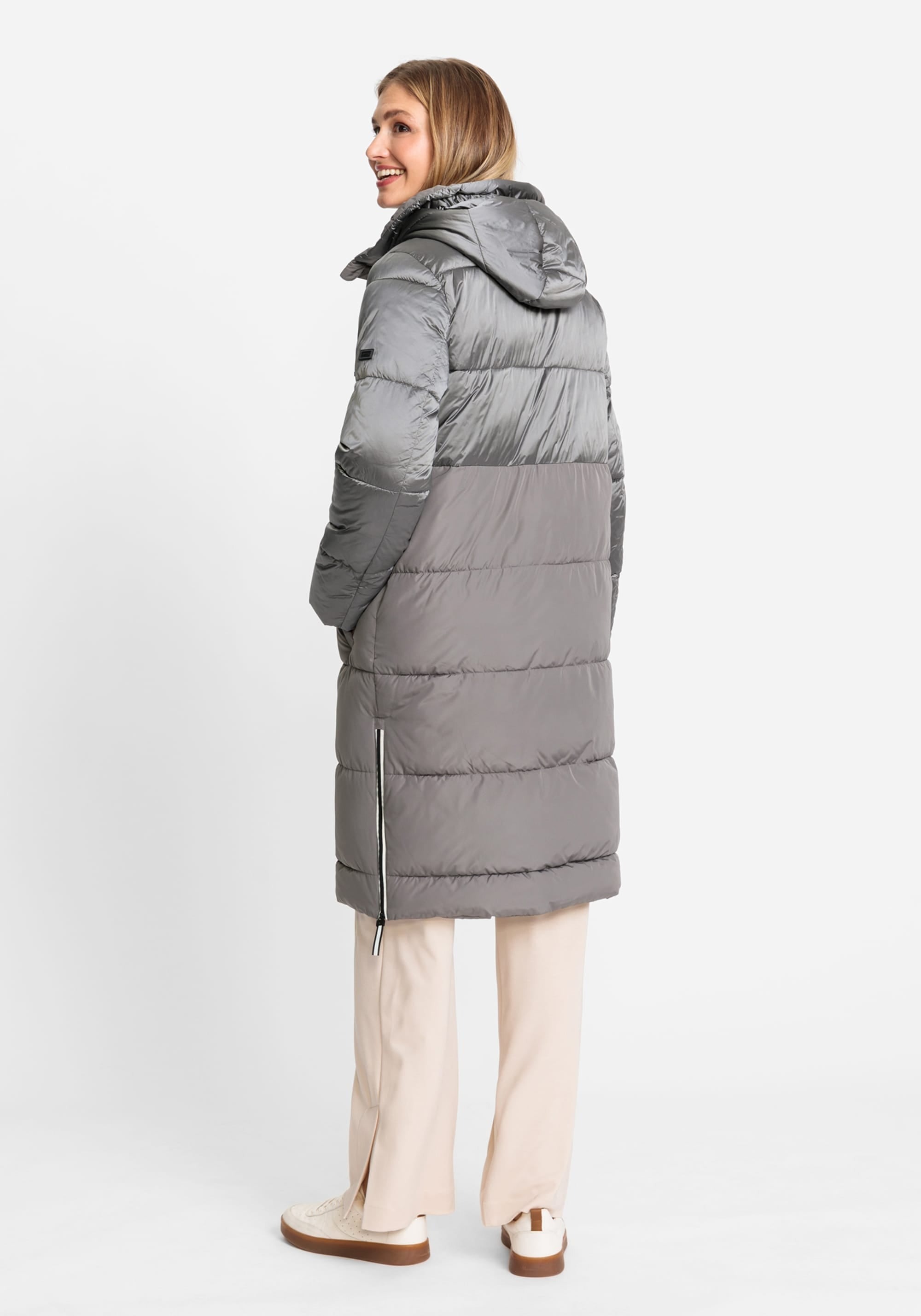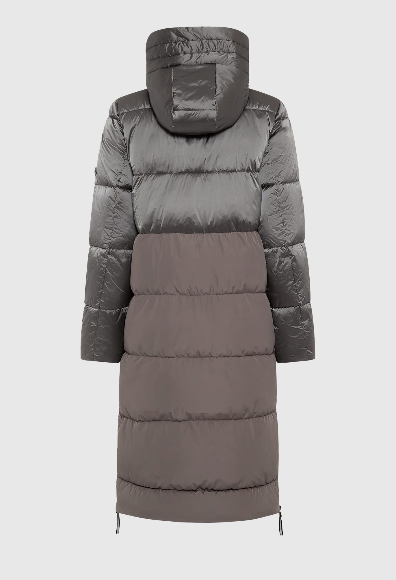 В куртке-пальто сочетаются блестящие матовые ткани одного тона. Широкие молнии по бокам на подоле для расширения формы, функциональная кулиска на капюшоне, двойная молния и потайной внутренний карман. Эта куртка обладает водоотталкивающими свойствами и содержит усовершенствованный синтетический термоизоляционный материал