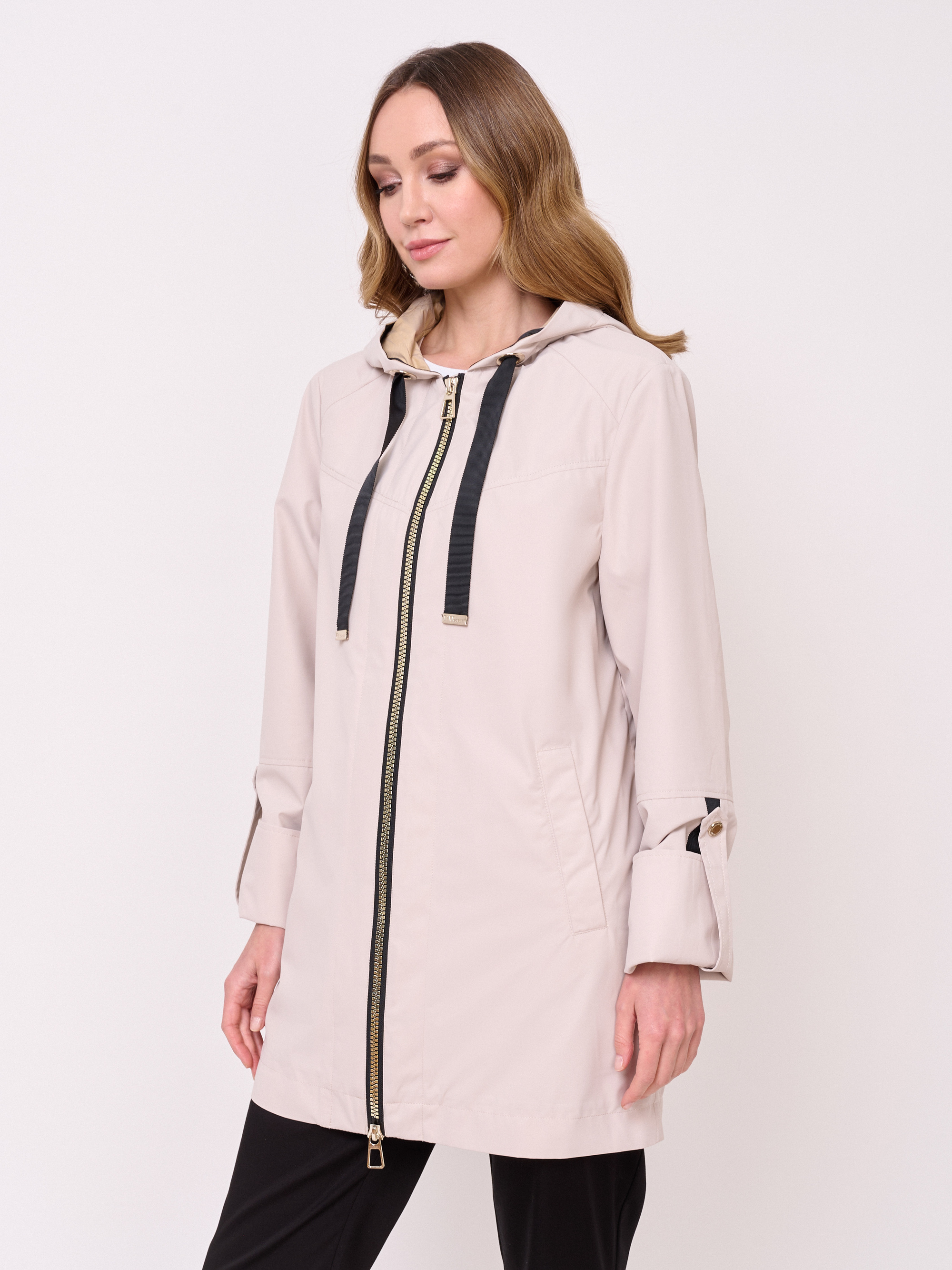 Застежка молния, несъемный капюшон с кулиской, рукава длинные с отворотами и хлястикамина кнопке, покрой прямой, без рисунка, без утепления, карманы прорезные, плотность утеплителя 0,01, без опушки, борты однобортное.