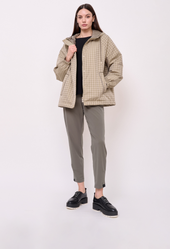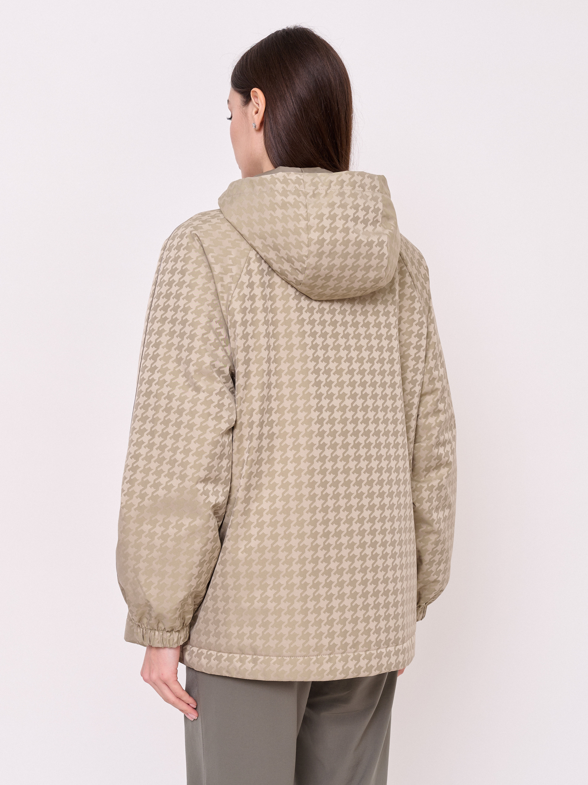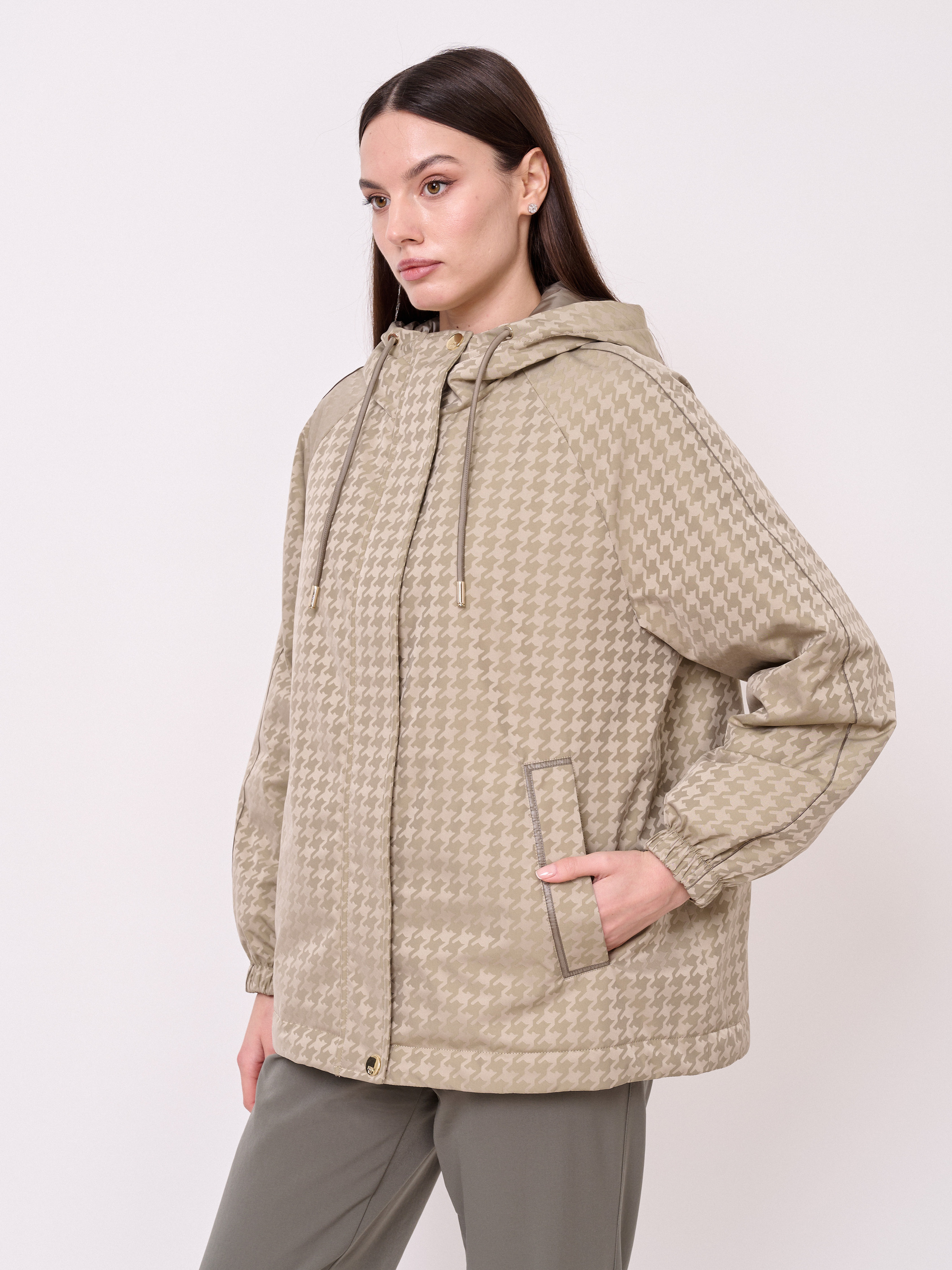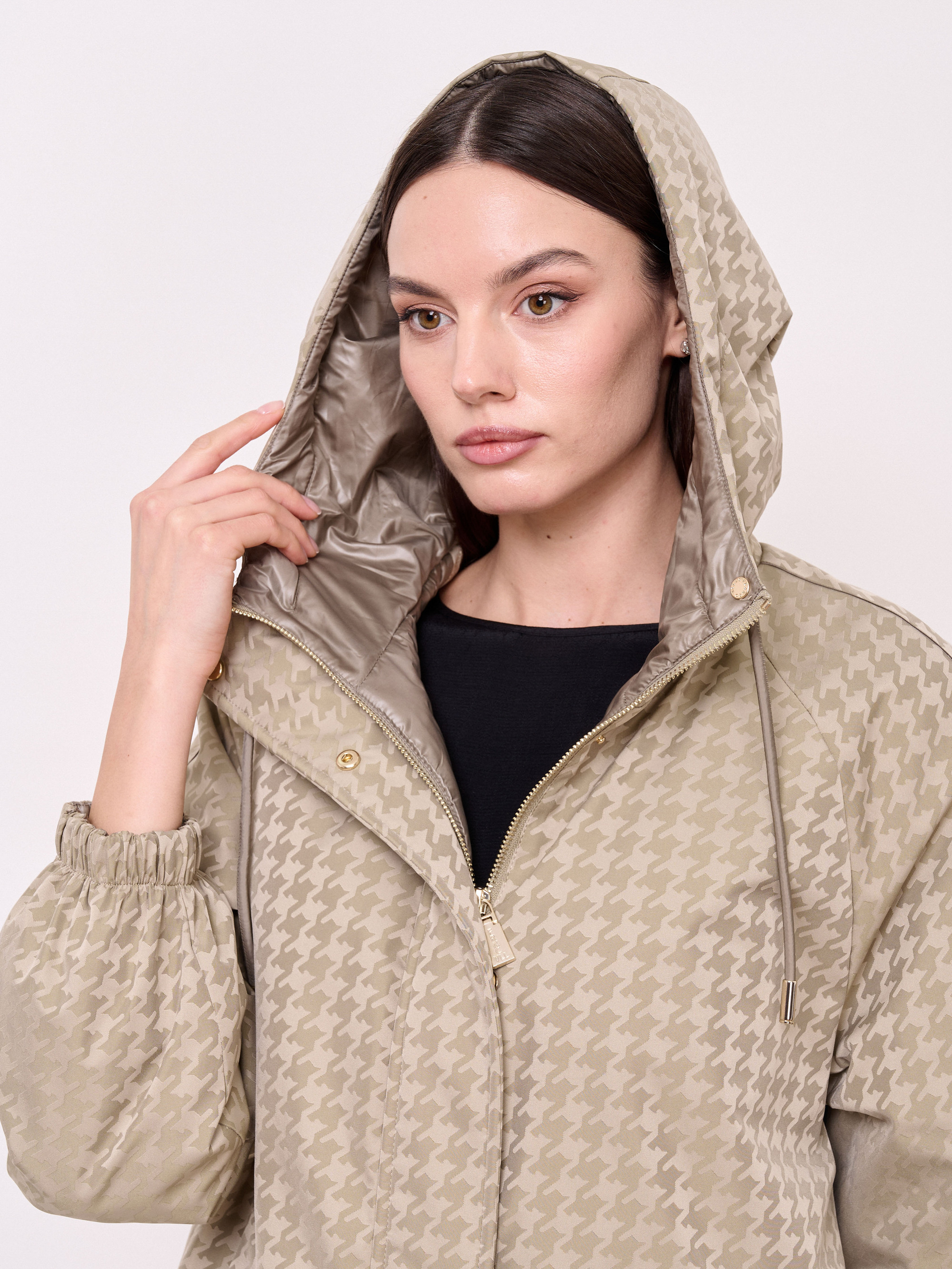 Застежка молния, опции капюшона несъемный капюшон на кулиске, рукава-реглан длинные, покрой прямой, рисунок гусиная лапка, утеплитель полиэстер, карманы прорезные, плотность утеплителя 80, без опушки, золотистая фурнитура. Длина по спинке: 70 см.