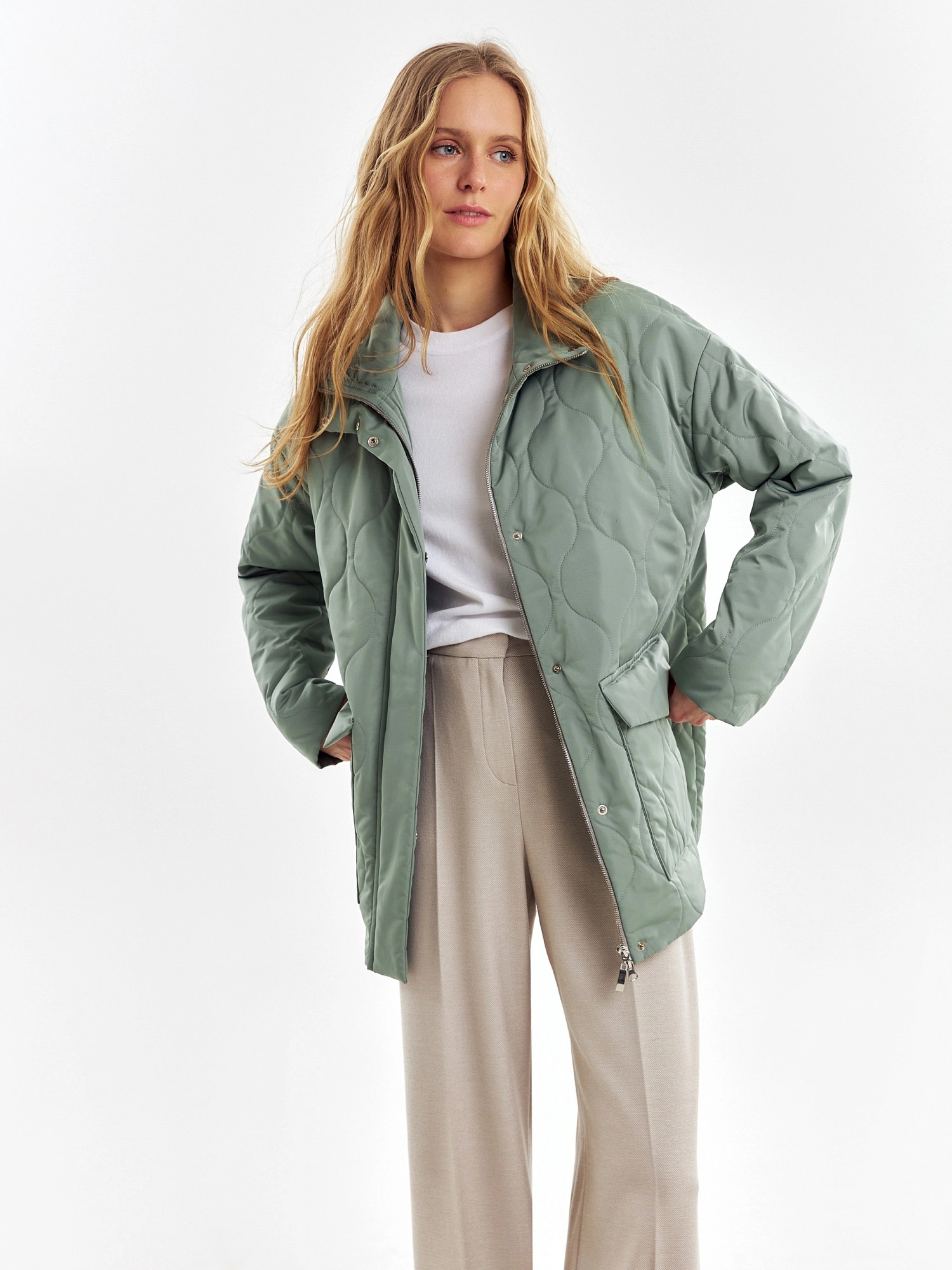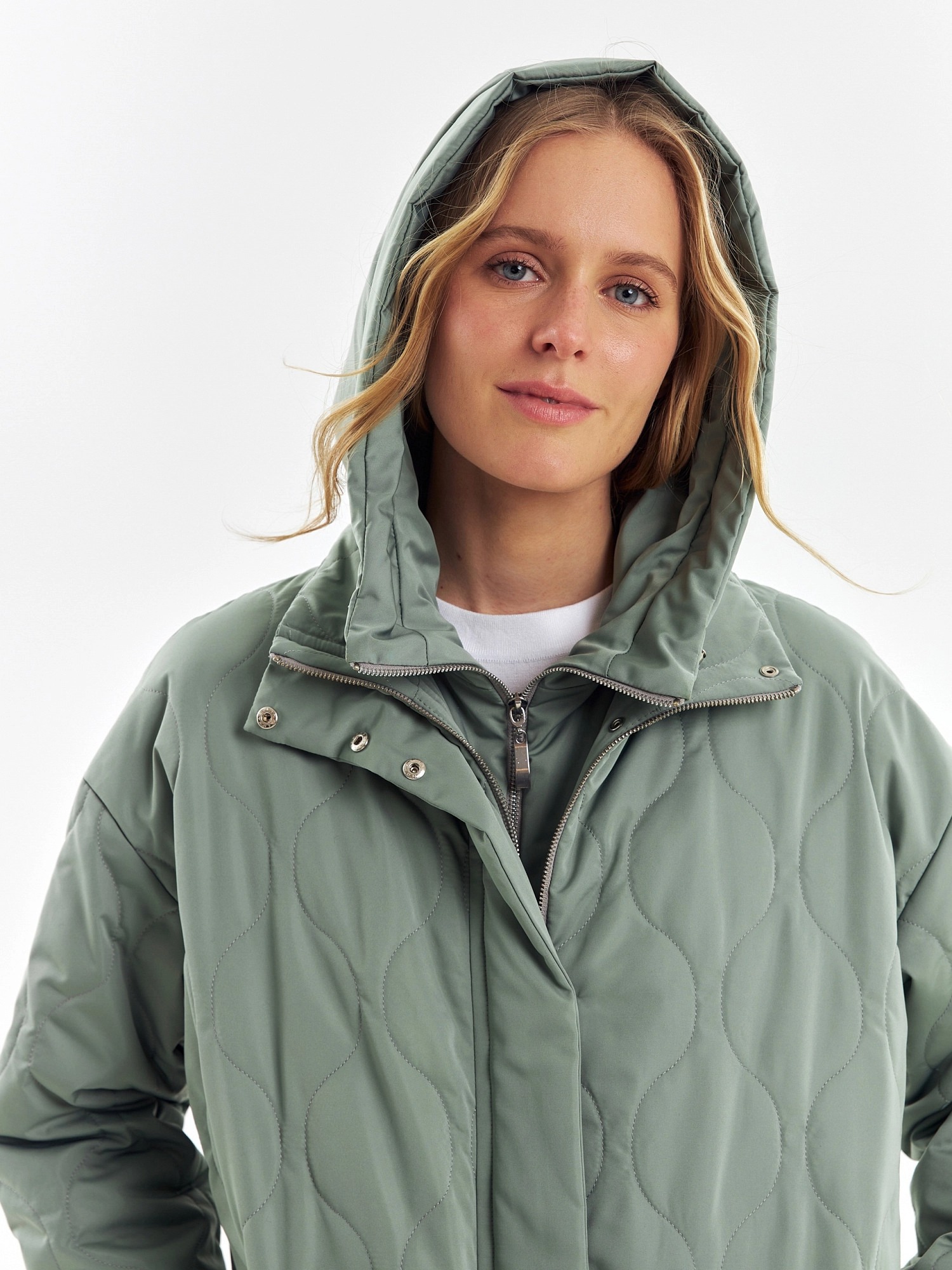 Короткая весенняя куртка из стеганой плащевой ткани в ультрамодном цвете "зеленый айсберг". Куртка имеет прямой силуэт, комфортный рубашечный рукав и высокий воротник-стойку. По бокам располагаются глубокие накладные карманы с клапанами. Застегивается изделие на молнию и установочные кнопки. В комплекте с курткой предлагается съемный капюшон с короткой манишкой. Капюшон, а также карманы и планка куртки выполнены из плащевой ткани-компаньона в цвете основной.