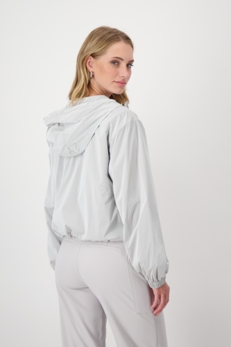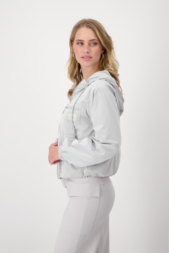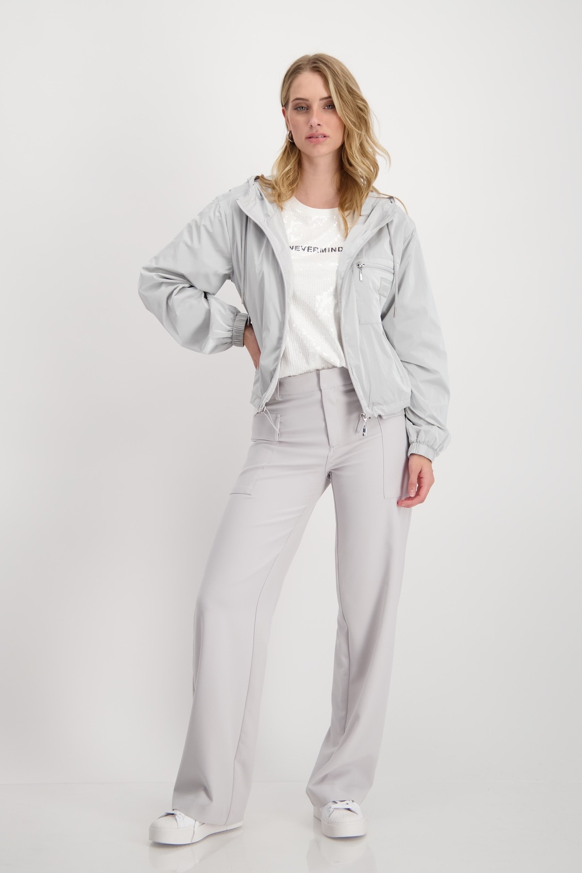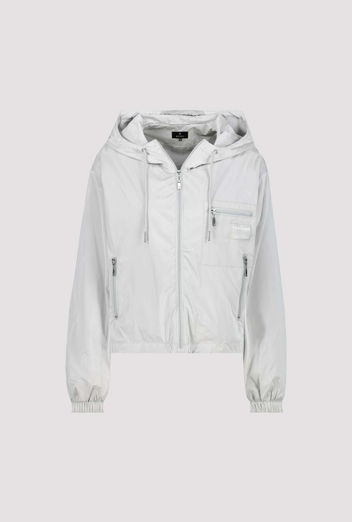 Блестящая куртка из нейлоновой ткани. С нашивкой и надписью. Мерцающее покрытие. Патч с надписью. Регулярная посадка. Капюшон с ремешком. Слегка перекрывающиеся длинные рукава. Подол рукава на резинке. Открытый карман на молнии. По низу потайная резинка с фиксатором шнура. Длина 44-го размера по спинке — 54 см, длина по переду — 56 см.