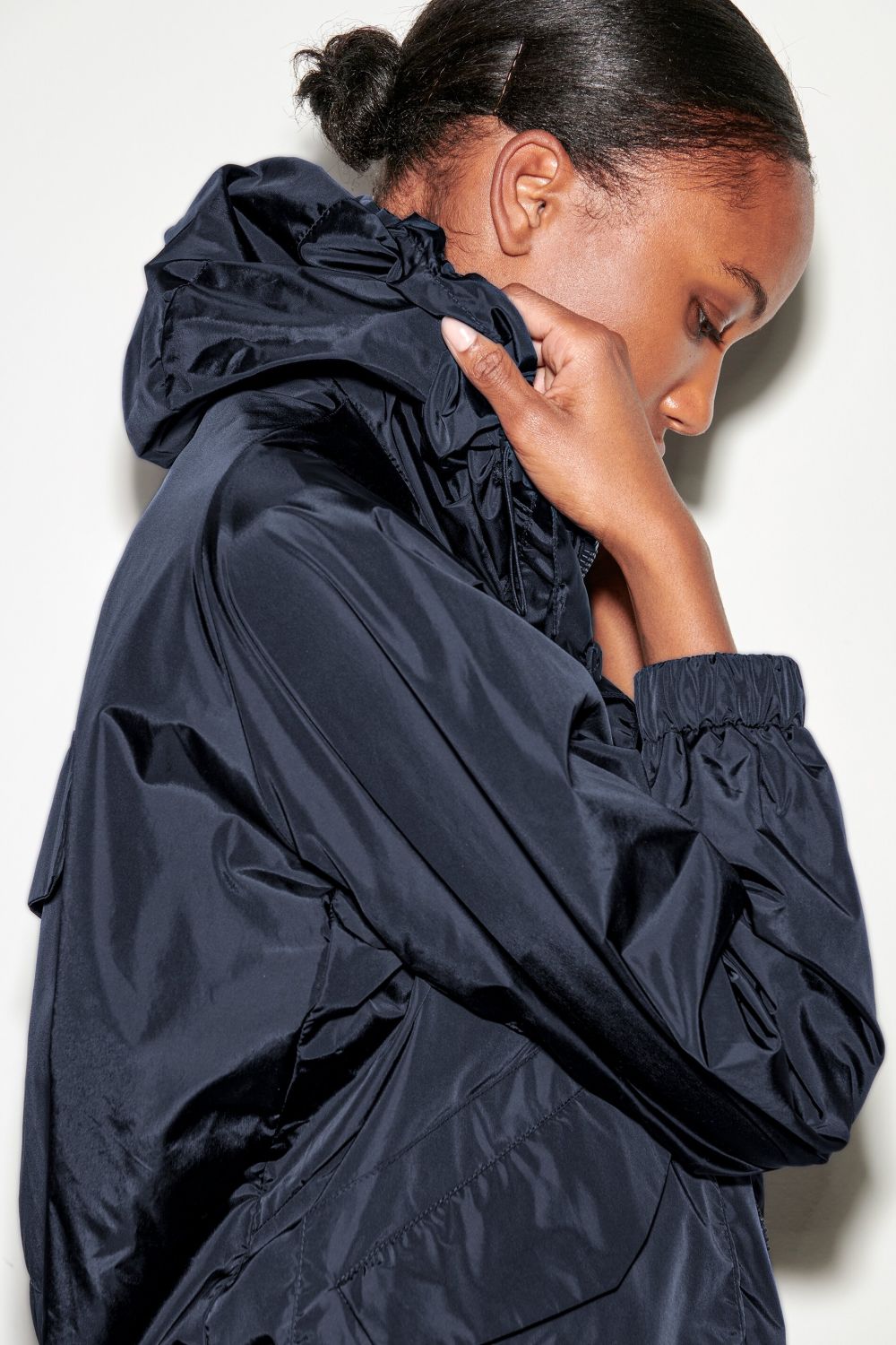 Легкая куртка из слегка переливающейся уличной тафты с фиксированным капюшоном, потайной двусторонней молнией спереди и двумя большими карманами с клапанами. Завязки на капюшоне и подоле позволяют индивидуально регулировать ширину.