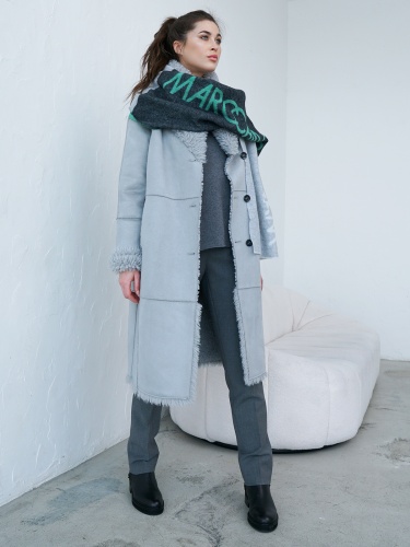 Экодубленка в базовом сером оттенке. Прямой силуэт, отделка имитирующая овчину. Застежка на контрастные пуговицы.