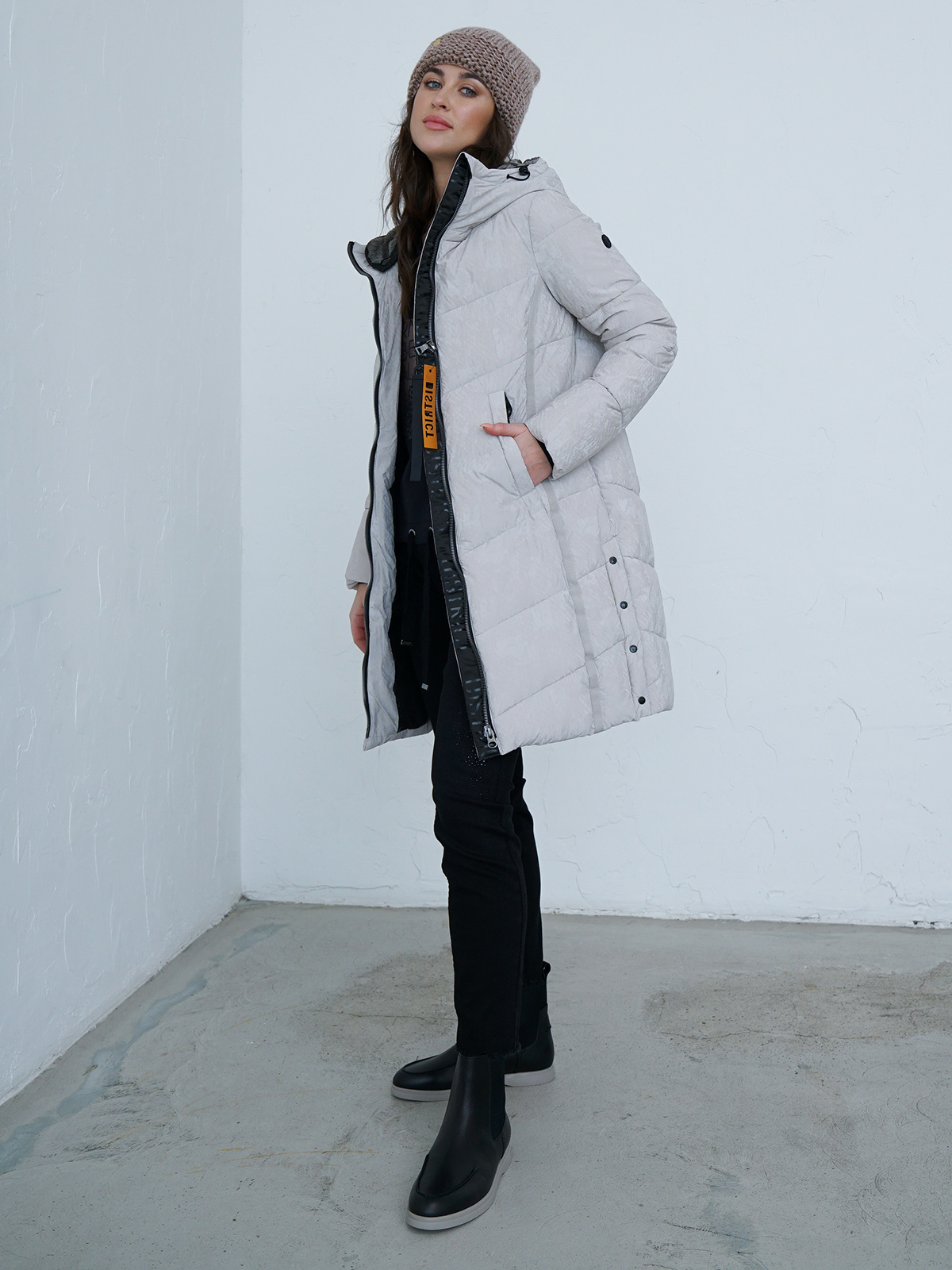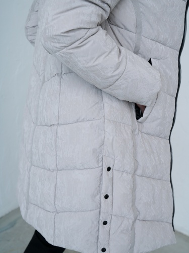 Стеганое однотонное пальто с синтепоном наполнителем. Контрастная молния. Объемный капюшон, боковые карманы с листочкой.