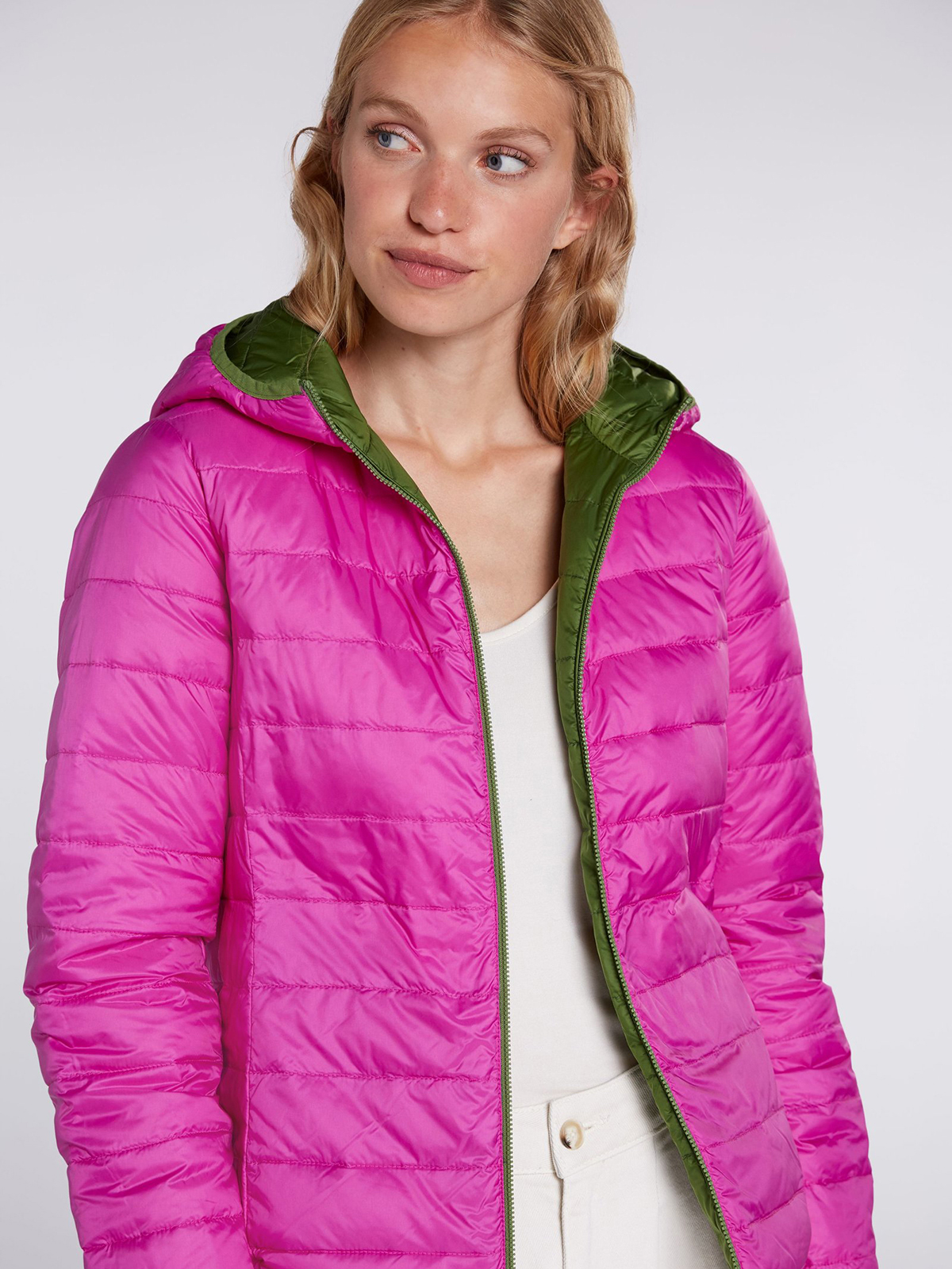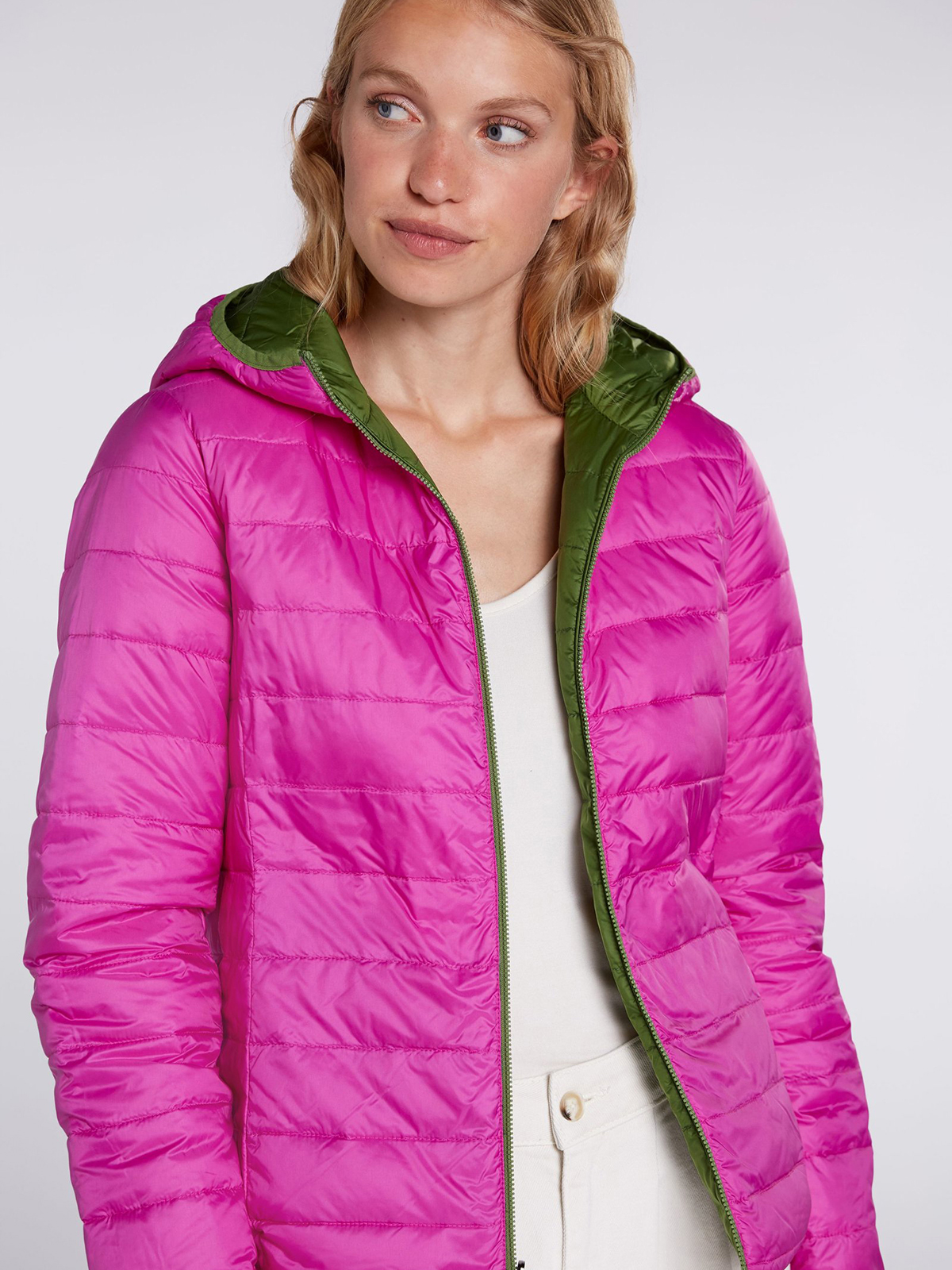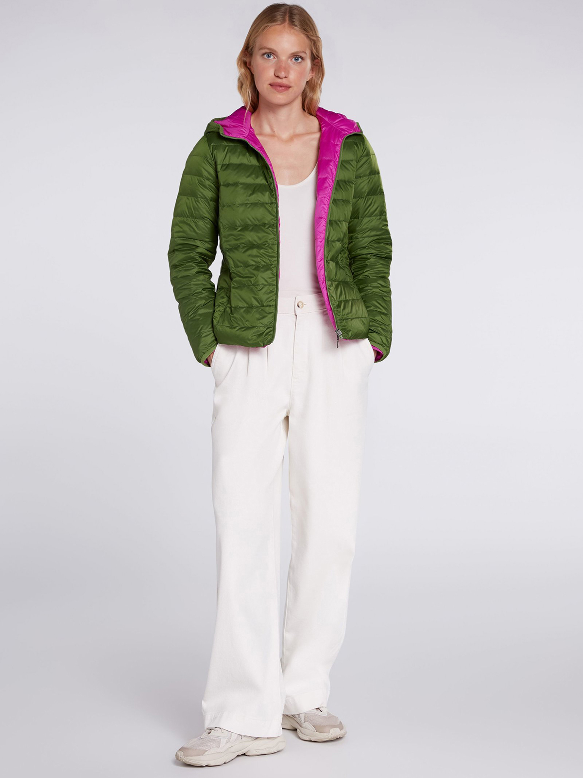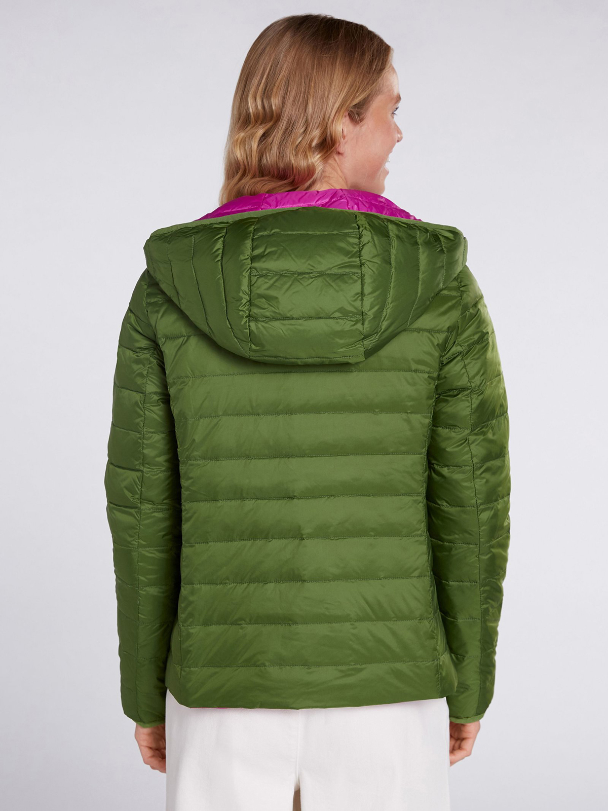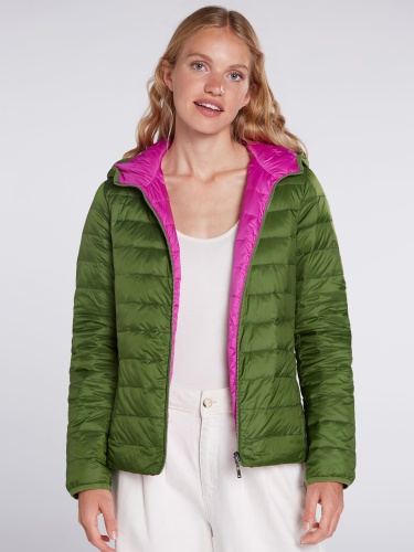 Двусторонняя куртка в оригинальной расцветке, сочетание насыщенного зеленого и яркой фуксии. Вместительный капюшон, застежка на молнию. Практичные боковые карманы. Длина 60 см для размера 42. Рост модели 178 см, ее размер – 42 (российский).
