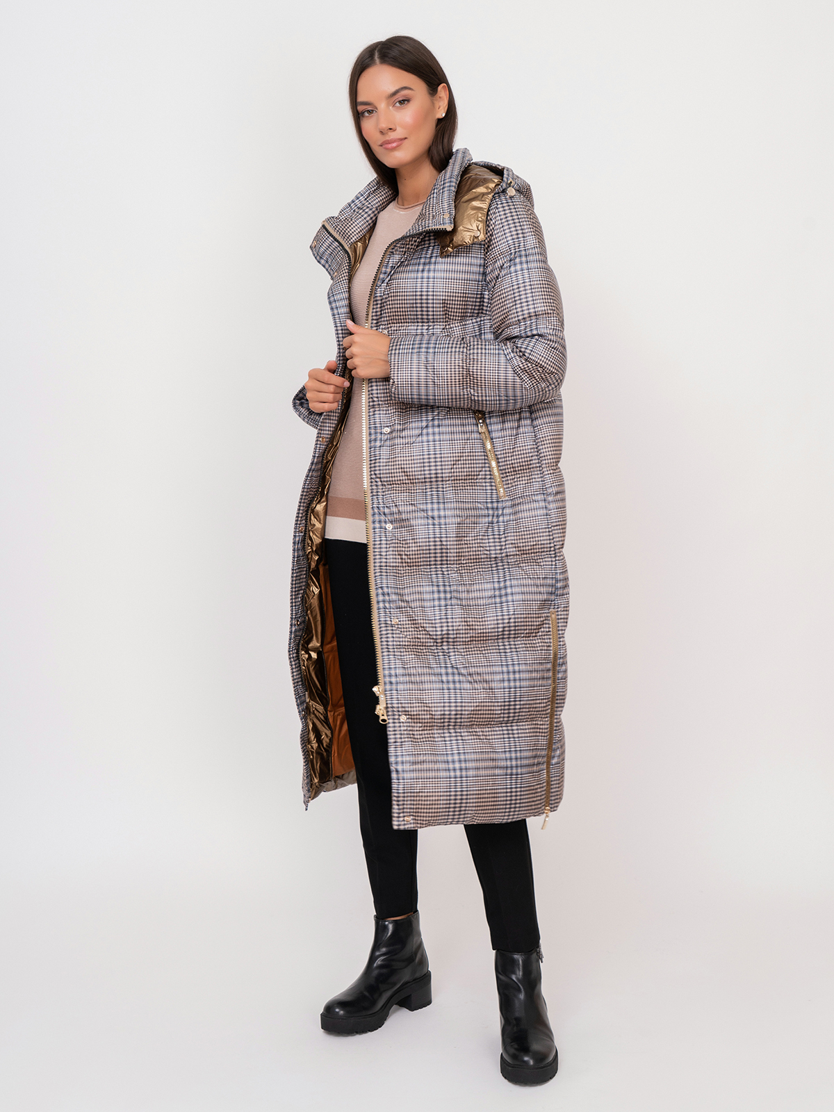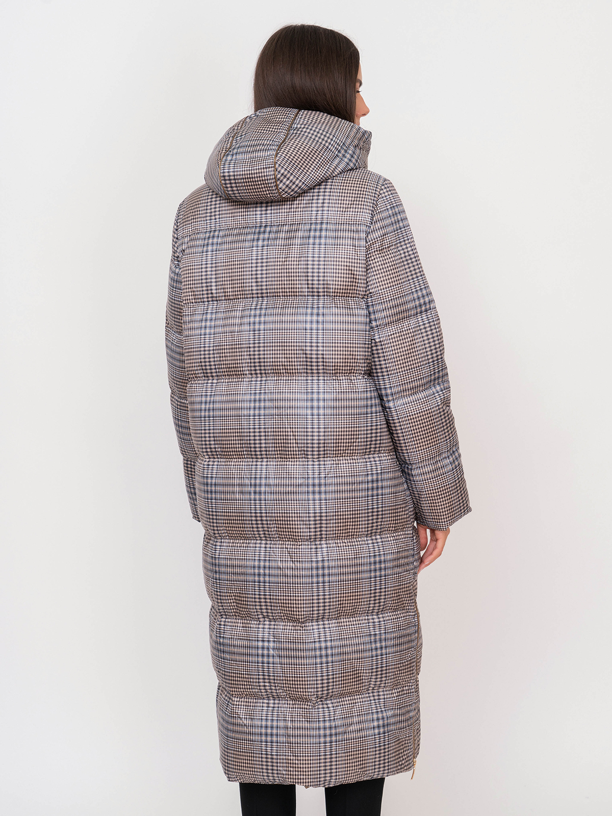 Стеганое пальто в клетку с пуховым наполнителем. Застежка на двойную молнию, ветрозащитная планка со скрытыми кнопками. Объемный капюшон, воротник стойка. Стильный базовый вариант пуховика, хорошо сочетается с различными нарядами.