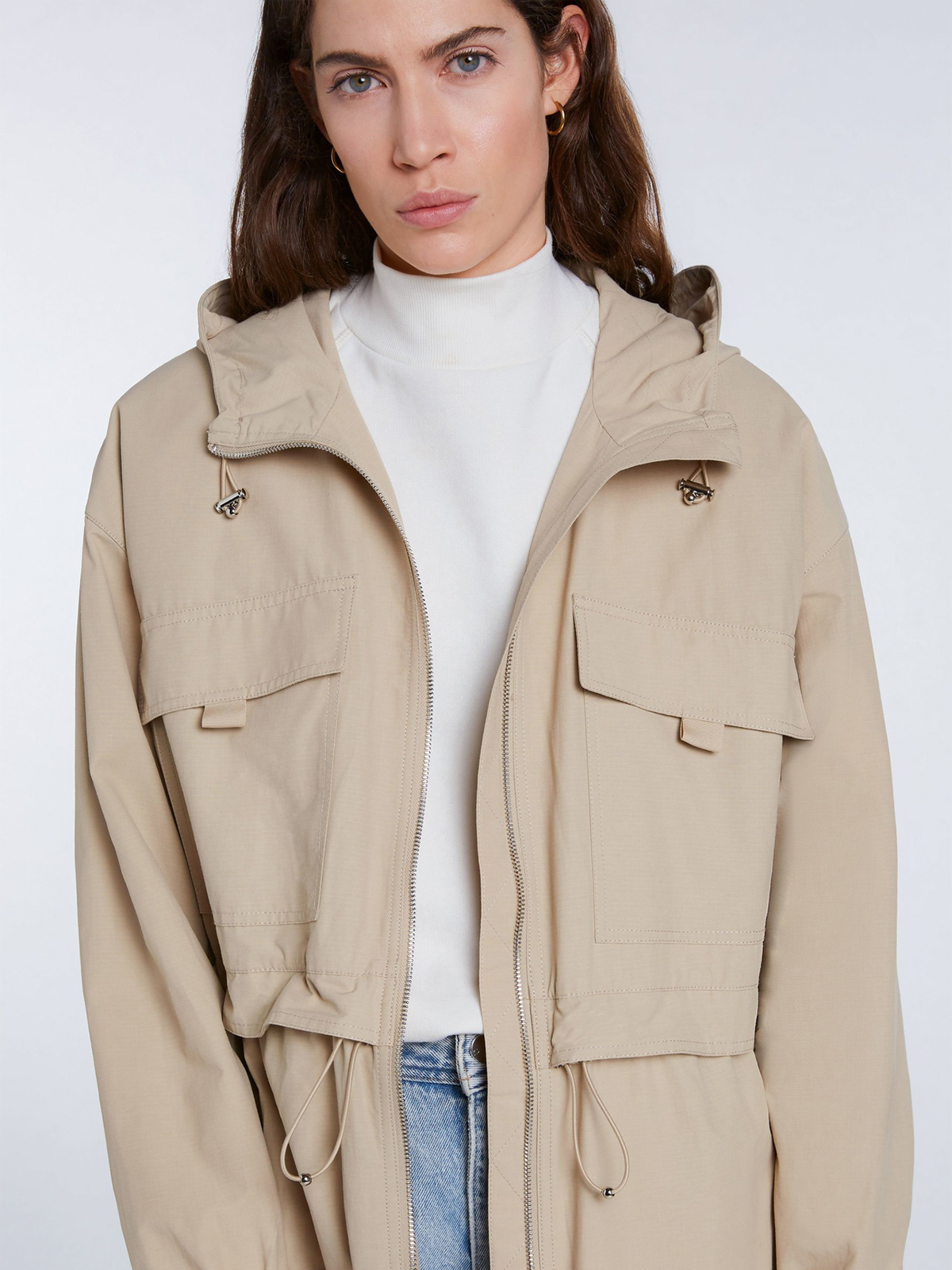 Однотонный плащ в трендовой нюдовой расцветке. Глубокий капюшон с кулиской, воротник-стойка. Кулиска на поясе позволяет создать приталенный силуэт. Объемные накладные карманы на груди, спущенная линия плеч.