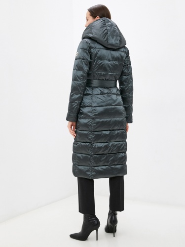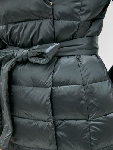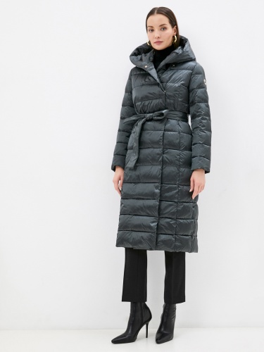 Стеганое пальто с наполнителем пух-перо. Застежка на молнии, ветрозащитный планка на кнопках, несъемный капюшон, боковые прорезные карманы с листочкой. В комплекте идет пояс из основного материала изделия. Пальто хорошо защитит от холода и дополнит образ в городском стиле.