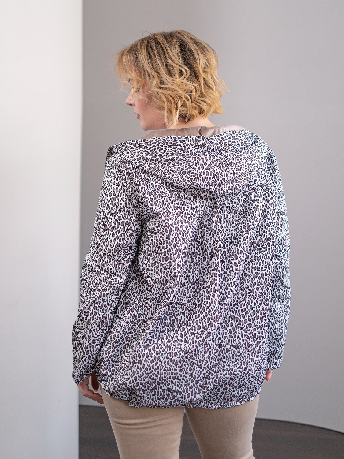 Куртка свободного силуэта выполнена в анималистичном принте. Застежка-молния. Втачной рукав полной длины Глубокий капюшон. Кулиска по низу изделия.