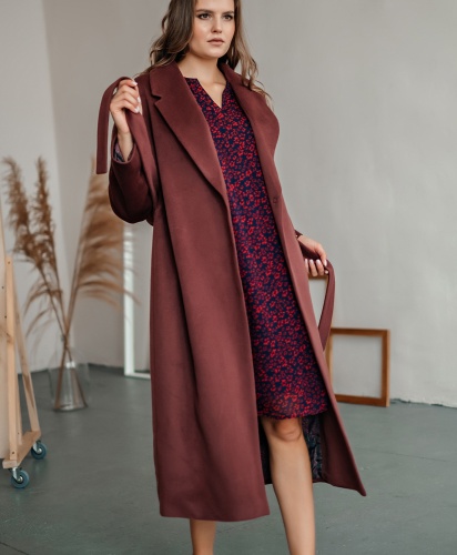 Пальто прямого силуэта длиной выше колена. Втачной рукав, застёжка на пришивные кнопки, английский воротник, горизонтальный подрез на полочке и спинке, вертикальные карманы-листочки.