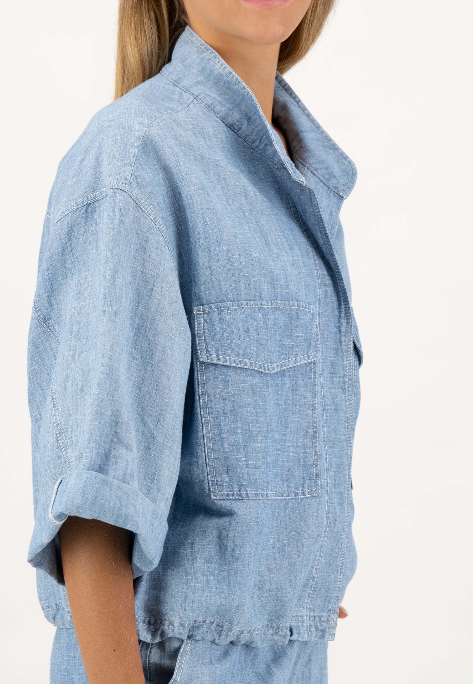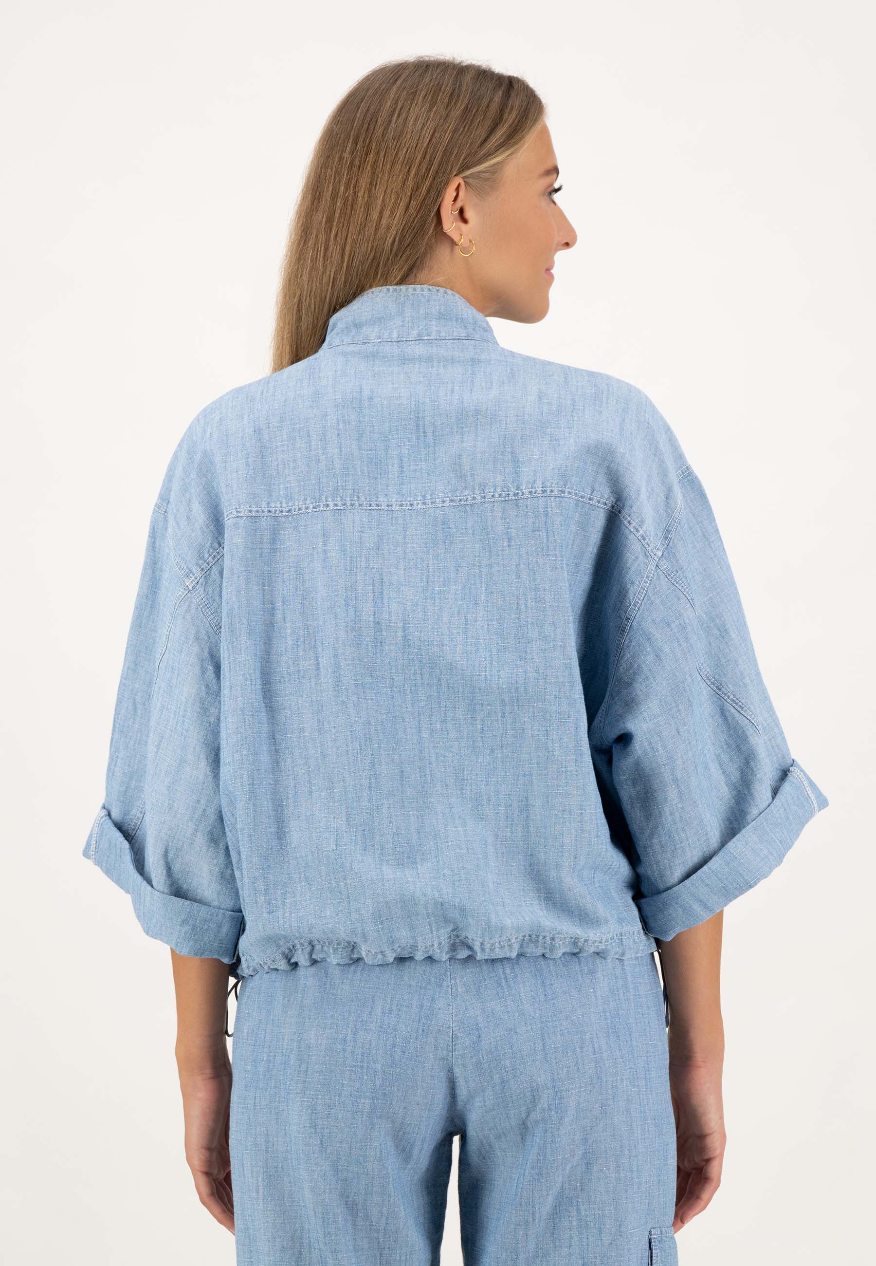 Повседневная куртка-рубашка с планкой на потайных пуговицах и карманами с клапанами.