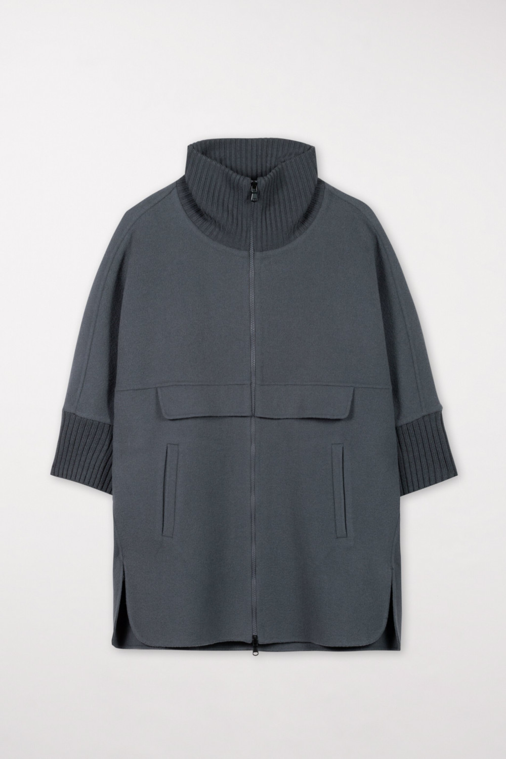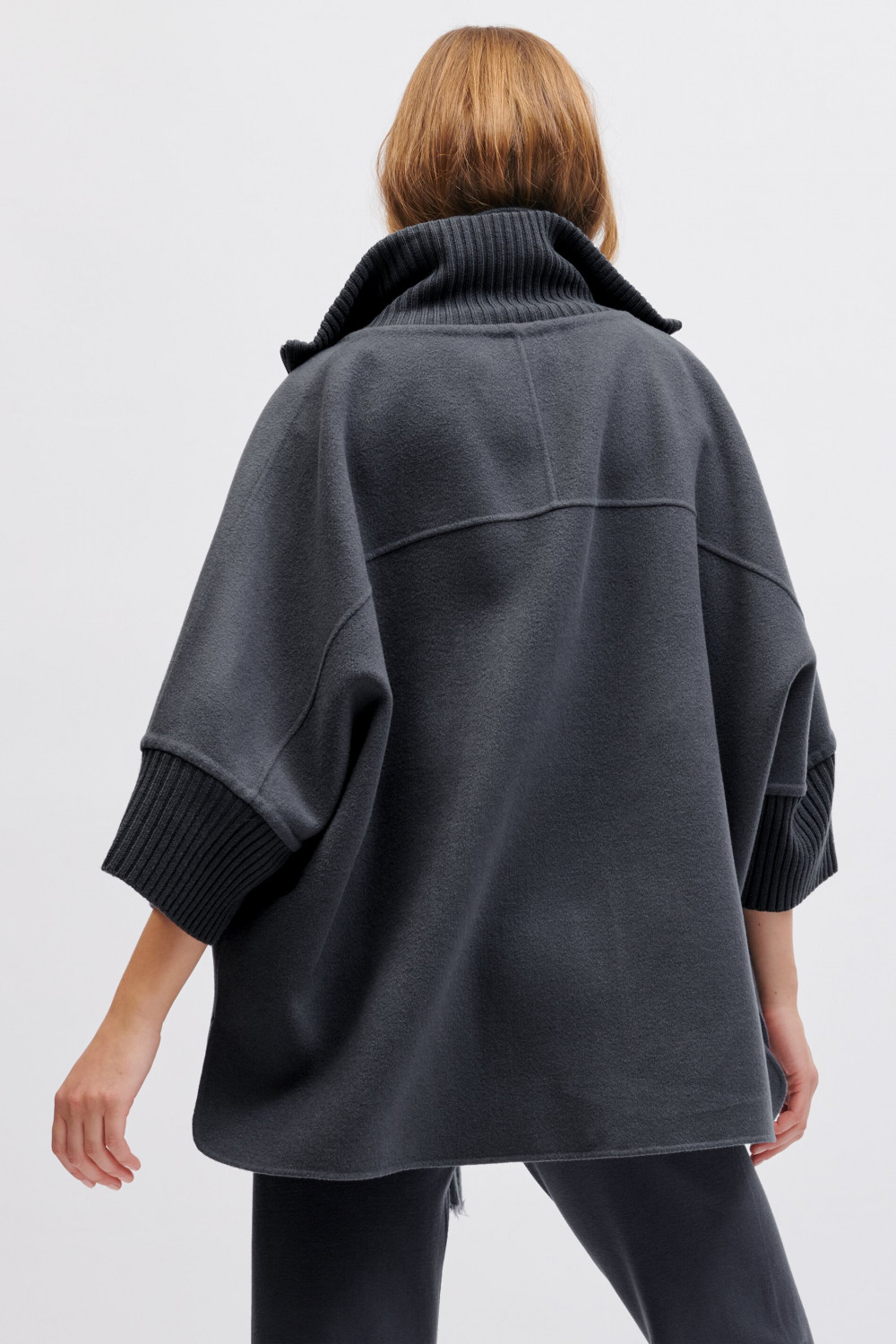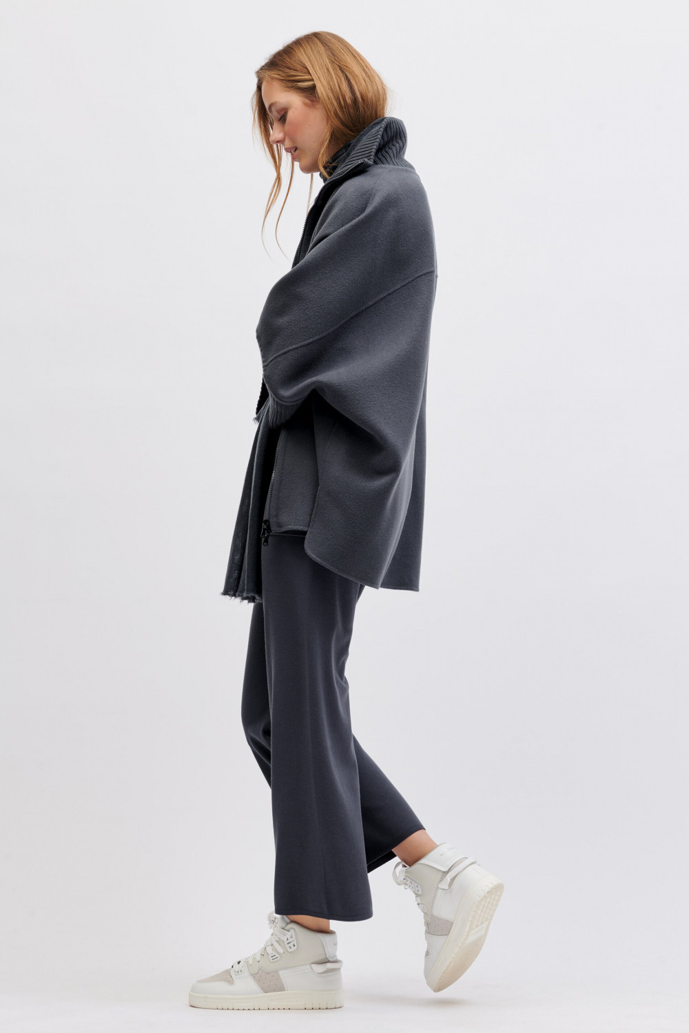 На сайте указаны российские размеры. Куртка-накидка из роскошной смеси шерсти и кашемира с высококачественной двусторонней отделкой и непрерывной двусторонней застежкой-молнией. Объемный воротник-стойка и широкие трикотажные манжеты создают изысканный контраст материалов. Модель ростом 178 см