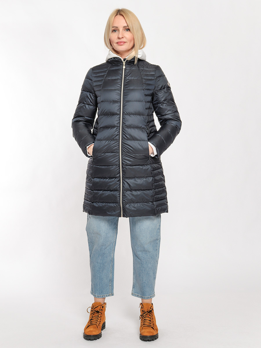 Стеганая однотонная куртка длиной до середины бедра. Застежка молния, боковые карманы на молнии.