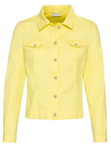 Приталенный жакет нежного желтого оттенка. Воротник с отворотами. Втачной рукав полной длины с манжетой на пуговице. Накладные карманы с клапанами на груди. Застежка на пуговицы.