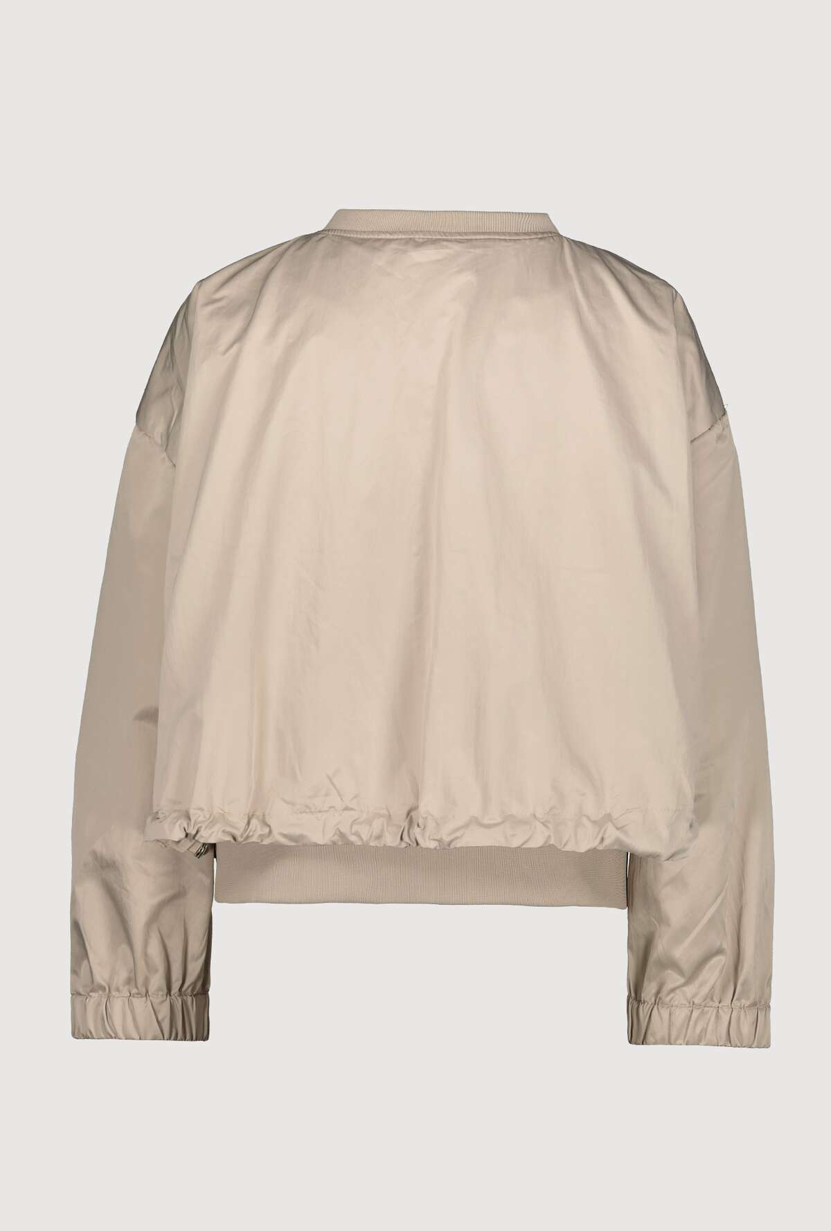 На сайте указаны Российские размеры. Короткая куртка с круглым вырезом и молнией. Прямой крой с круглым вырезом горловины в рубчик, манжетами на резинке и объемными плечами. Модель с длинными рукавами состоит из 2 слоев: верхний слой имеет боковые разрезы, кулиску и резинку с фиксатором шнура, а нижний слой имеет широкие манжеты в рубчик и потайные прорезные карманы. Параметры модели: 42 размер, рост 176 см