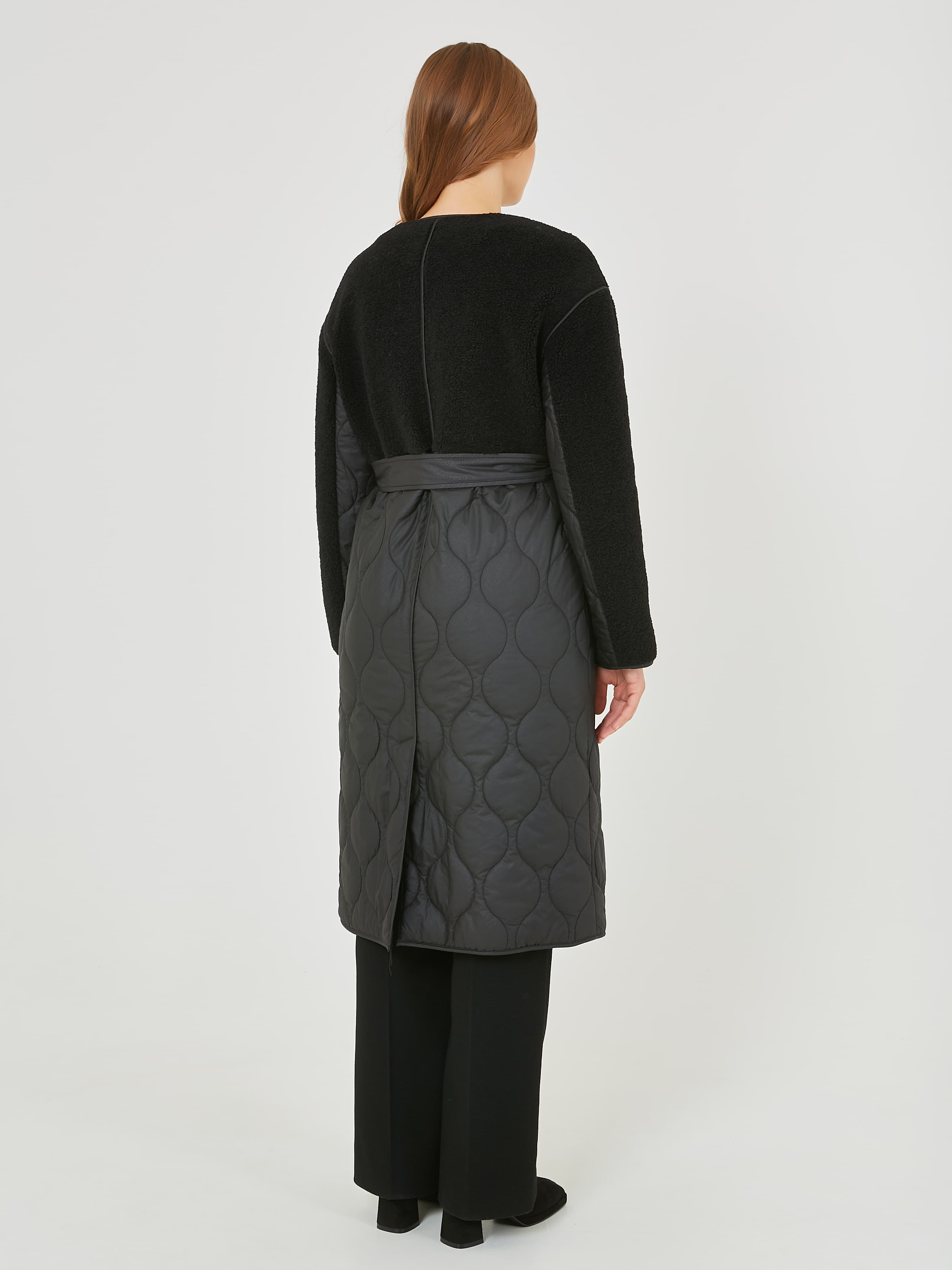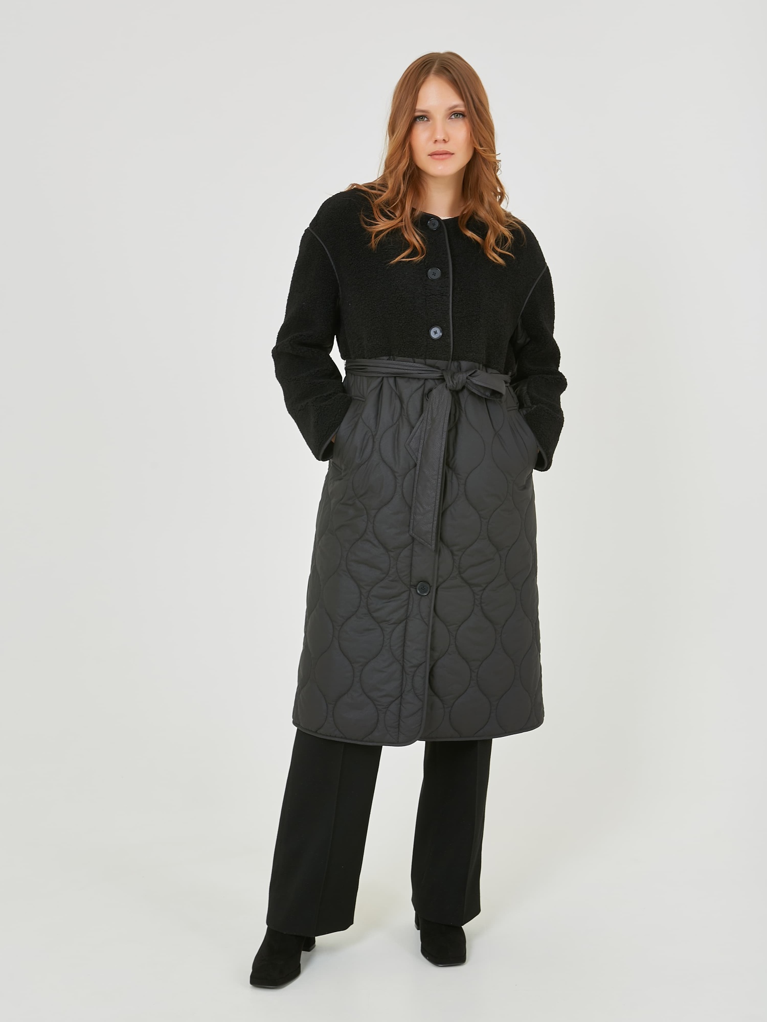 Пальто прямого кроя с крупными пуговицами сочетает мягкий светлый материал в верхней части с бежевым стеганым низом, придающим тепло и уют.Осень-Зима'25/26. Капсула "Вишневый сад". Параметры модели: 95-64-101, рост 175, размер 44-46