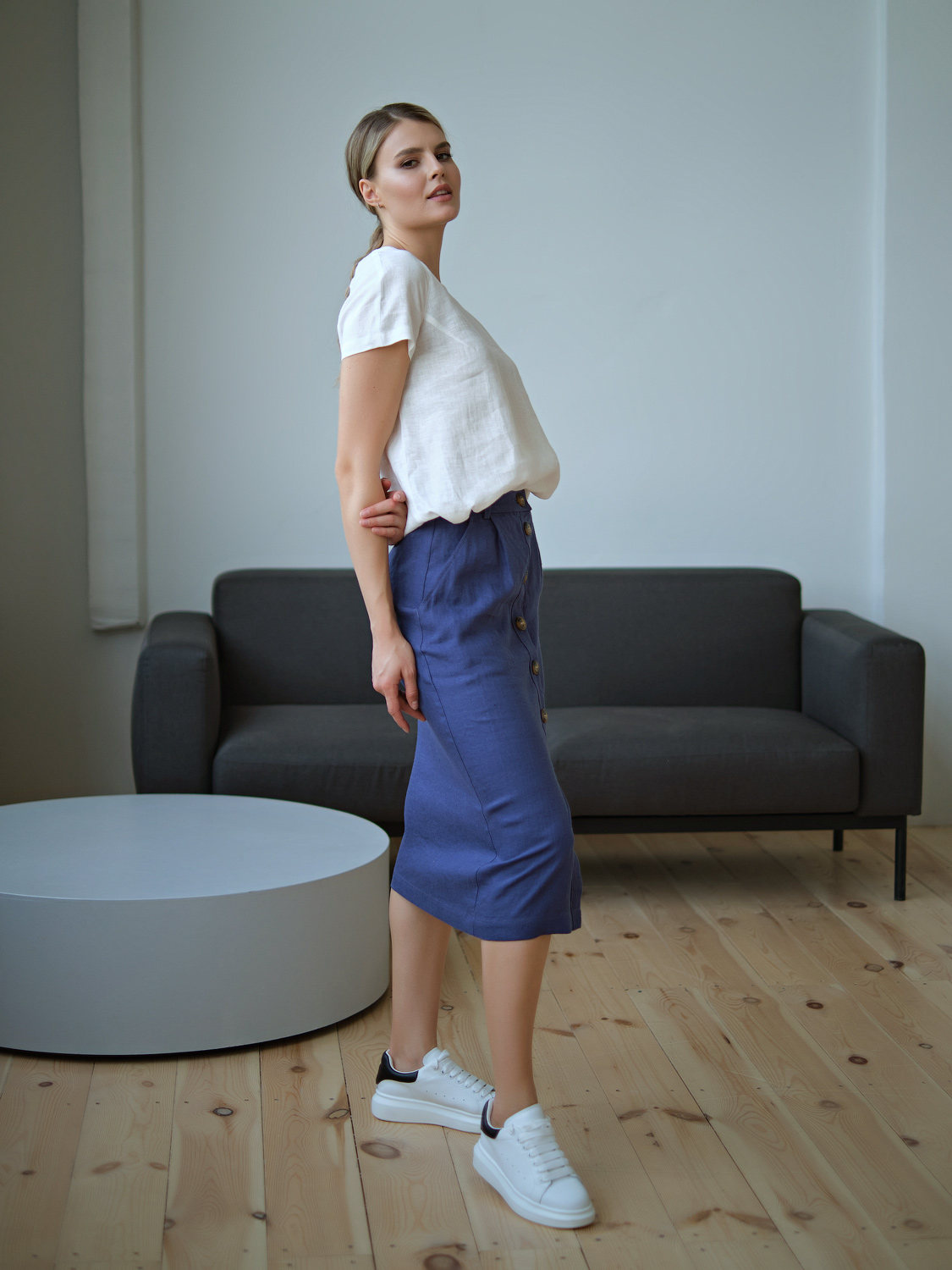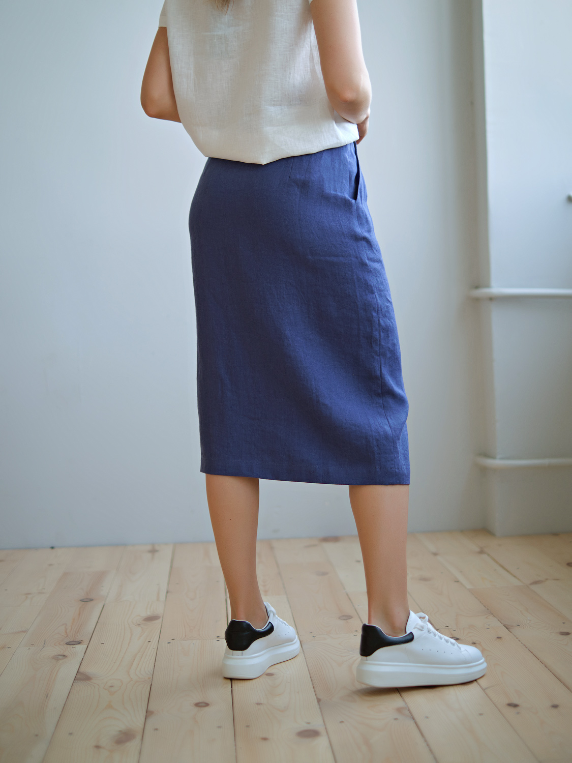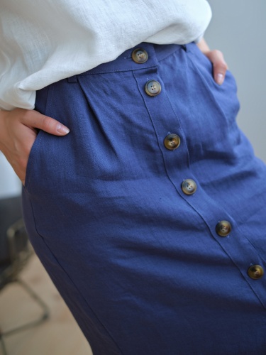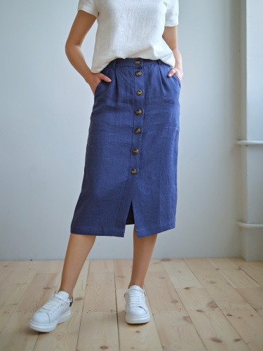 На сайте указаны российские размеры. Ткань: юбка из 100 натурального льна, идеально дышащего и комфортного материала. Крой: юбка прямого силуэта по типу «карандаш» имеет достойную длину ниже колена, что позволяет выбирать эту модель женщинам разных комплекций. Застежка-планка с пуговицами – универсальная модель, которую выбирают не только за стильный внешний вид, но и за комфорт – расстегнув одну или несколько пуговиц, можно добиться идеального комфорта при шаге. Красивые защипы в области пояса подчеркивают талию и добавляют романтичности всему образу. Небольшие, но удобные карманы функциональны и готовы выполнить свое предназначение. Отделка: стильный черничный оттенок придает юбке джинсовое звучание, а контрастные пуговицы в природном цвете только подчеркивают несравненный стиль. Юбка комбинируется с блузками, рубашками, тонкими водолазками и вязаными джемперами.