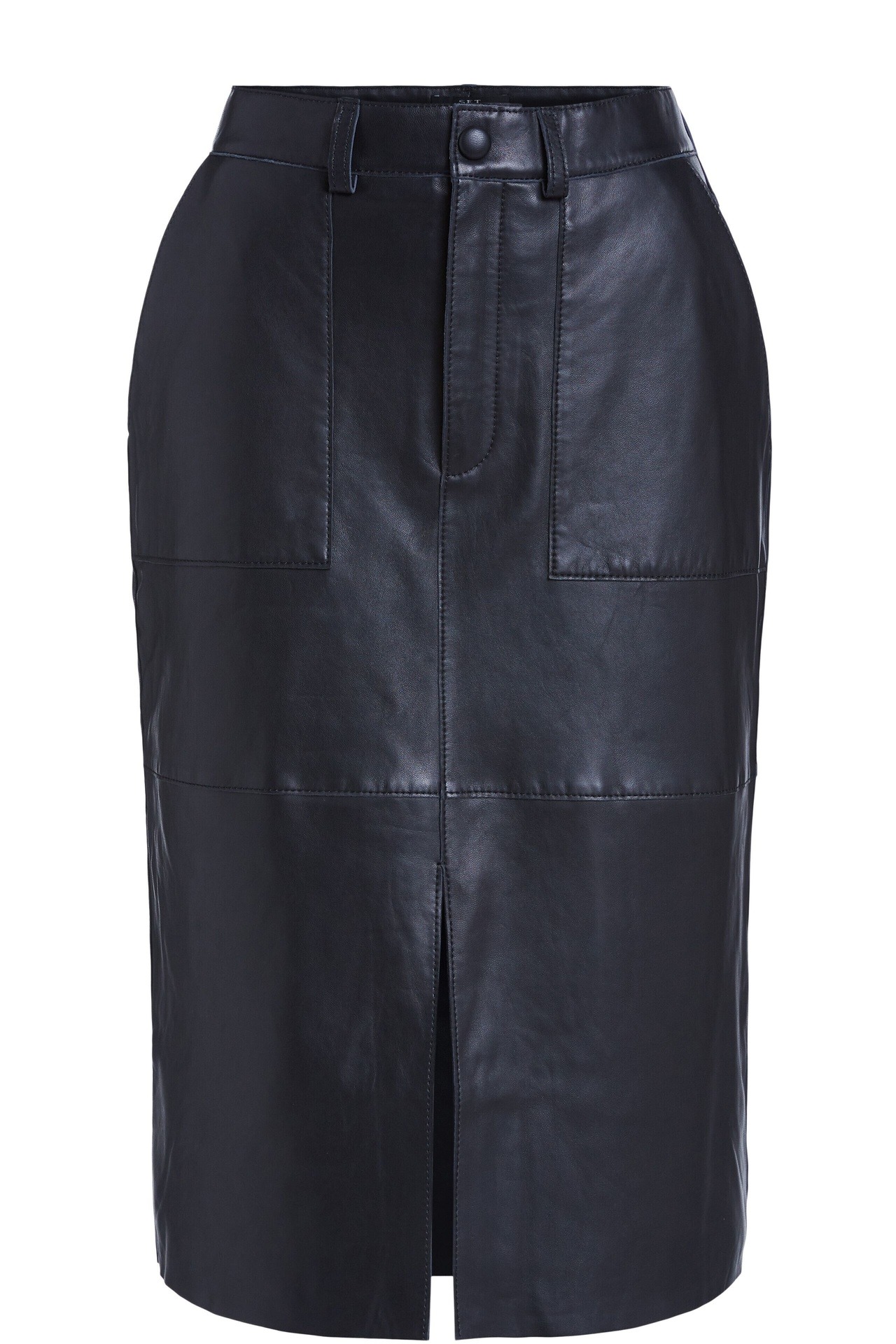 Юбка из натуральной кожи прямого кроя с рельефами. Застежка спереди на молнию и пуговицу. Накладные карманы и разрез спереди.