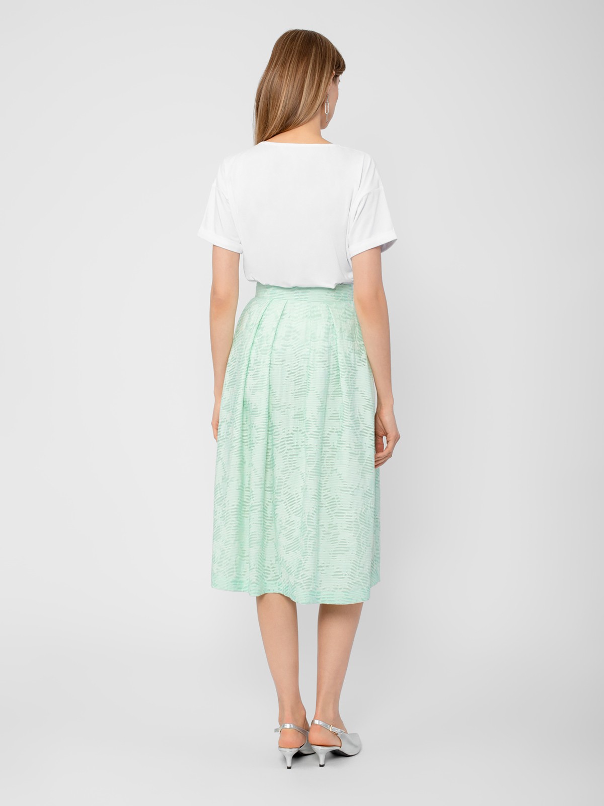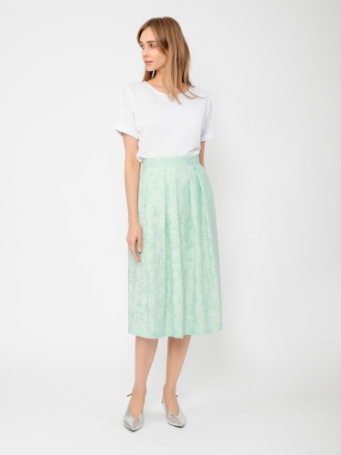 Юбка из плательной ткани с принтом. А-силуэт, притачной пояс со складками. Застежка сбоку на потайную молнию.