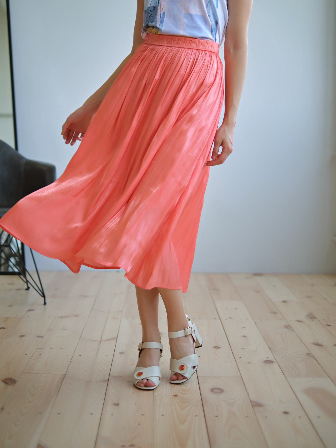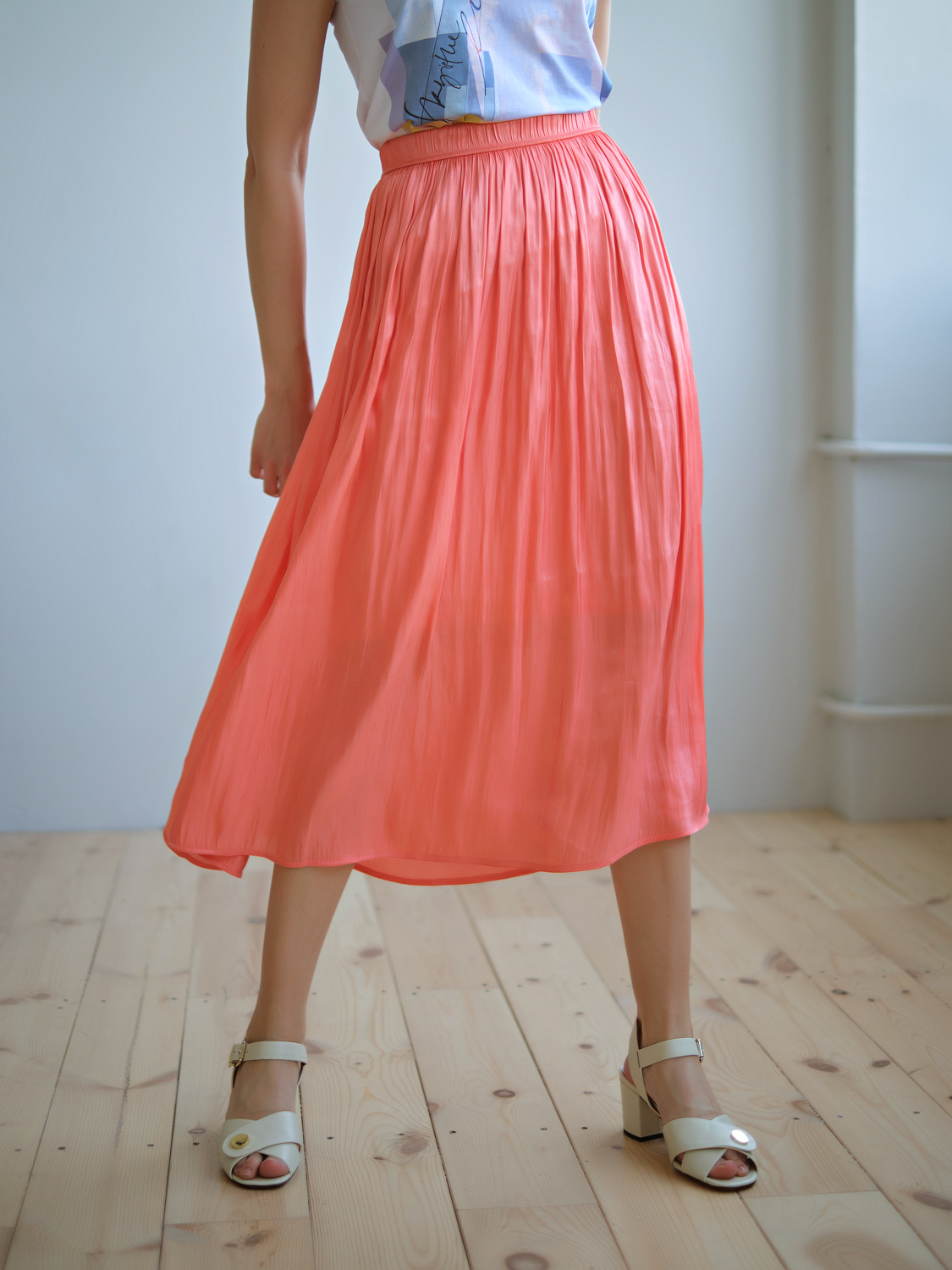 Юбка миди универсального А-силуэта подойдет как для повседневного, так и для праздничного образа. Выполнена из ткани с металлическим отливом. Материал подкладки – вискоза с добавлением эластана. Эластичный пояс обеспечивает комфортную посадку и удобство ношения.