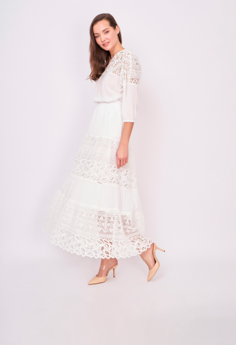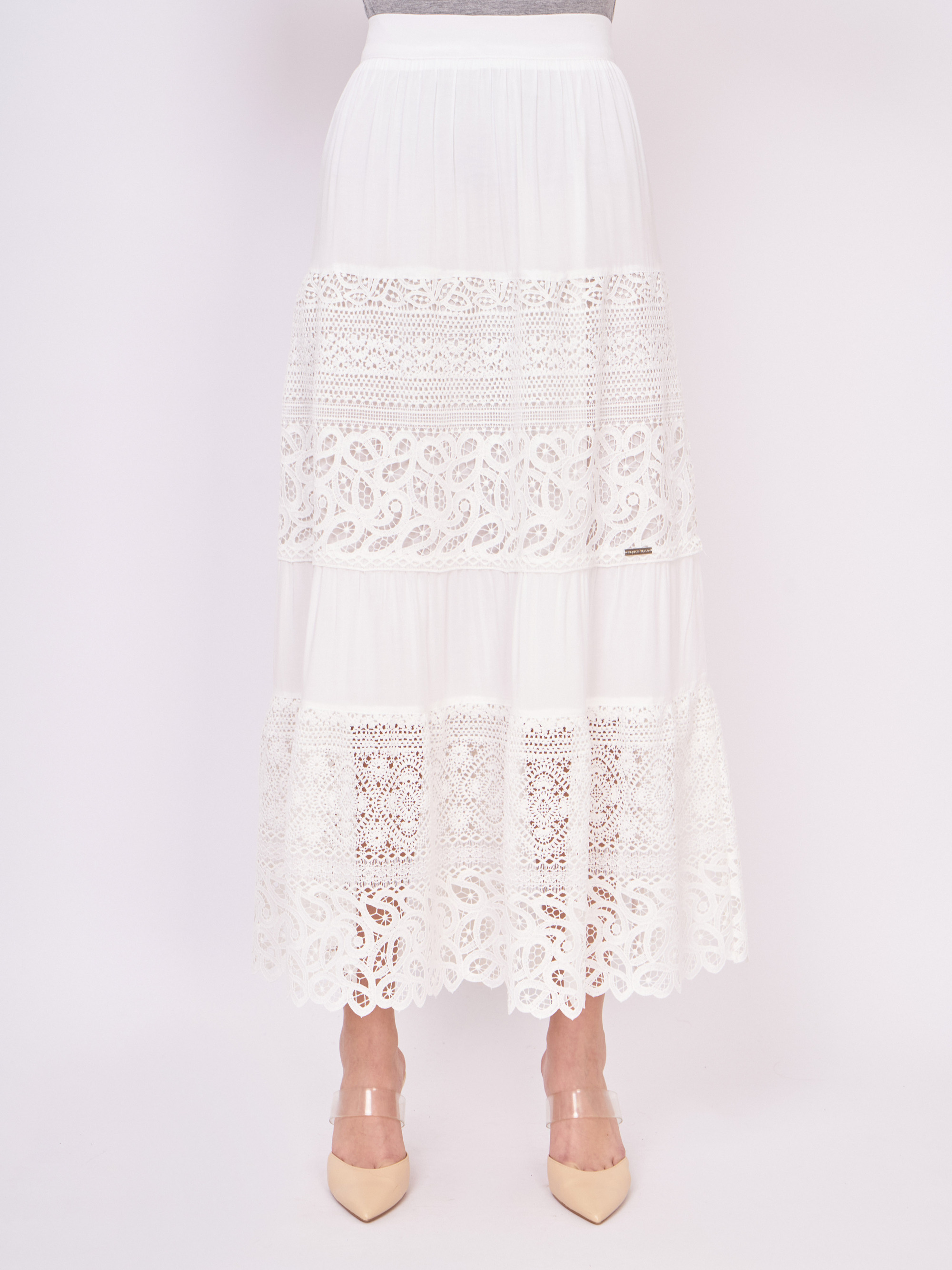 На сайте указаны российские размеры. Текстильная белая макси юбка трапеция на молнии, с кружевными вставками, с воланами. Длина юбки: 97 см. Рост модели: 177 см.