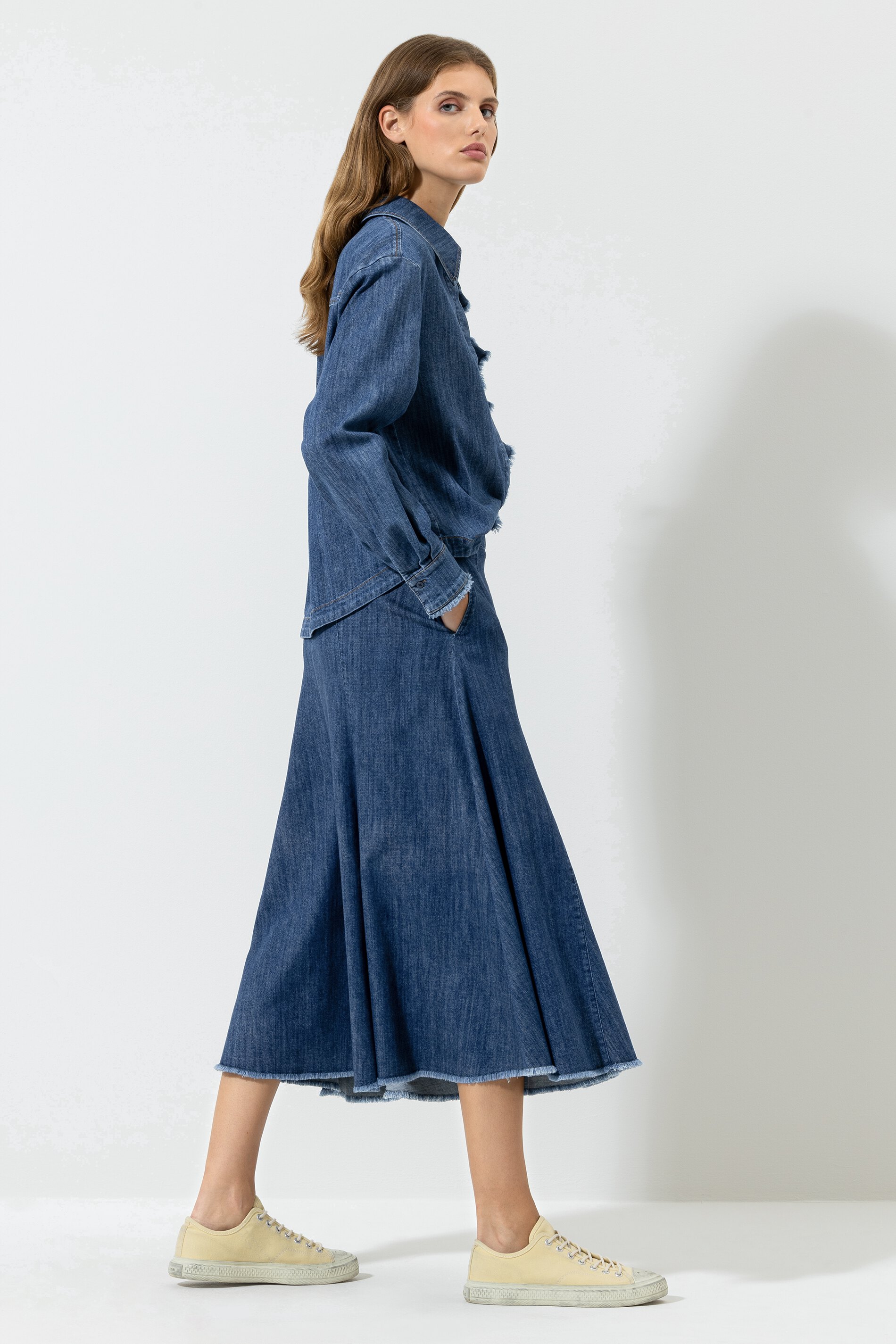 На сайте указаны российские размеры. Юбка-годе средней длины из натуральной легкой эластичной джинсовой ткани с эффектом потертости и молнией сзади. Нижний край украшен тонкой бахромой. Рост модели 178 см