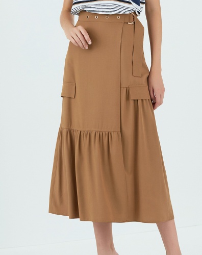 Юбка А-силуэта с запáхом, декоративными клапанами и сложными ярусами. Длина миди.