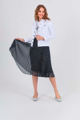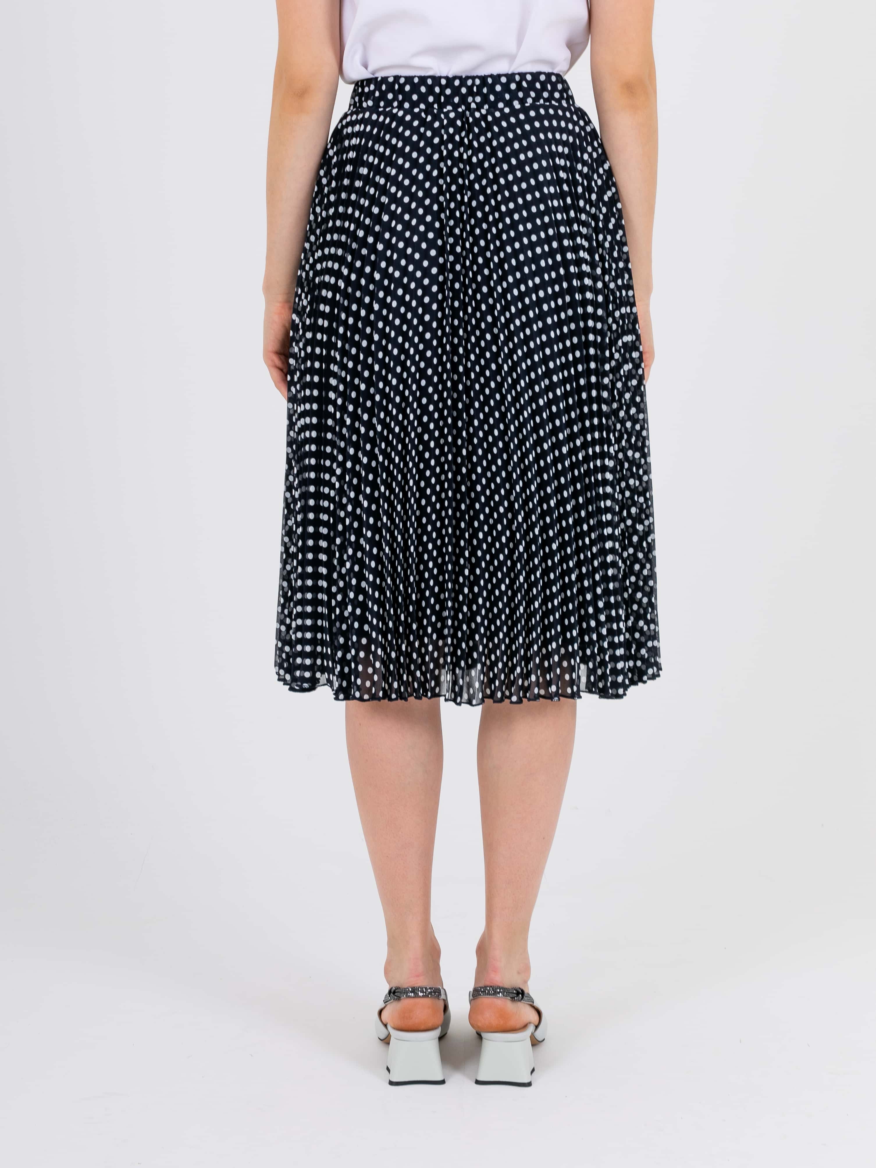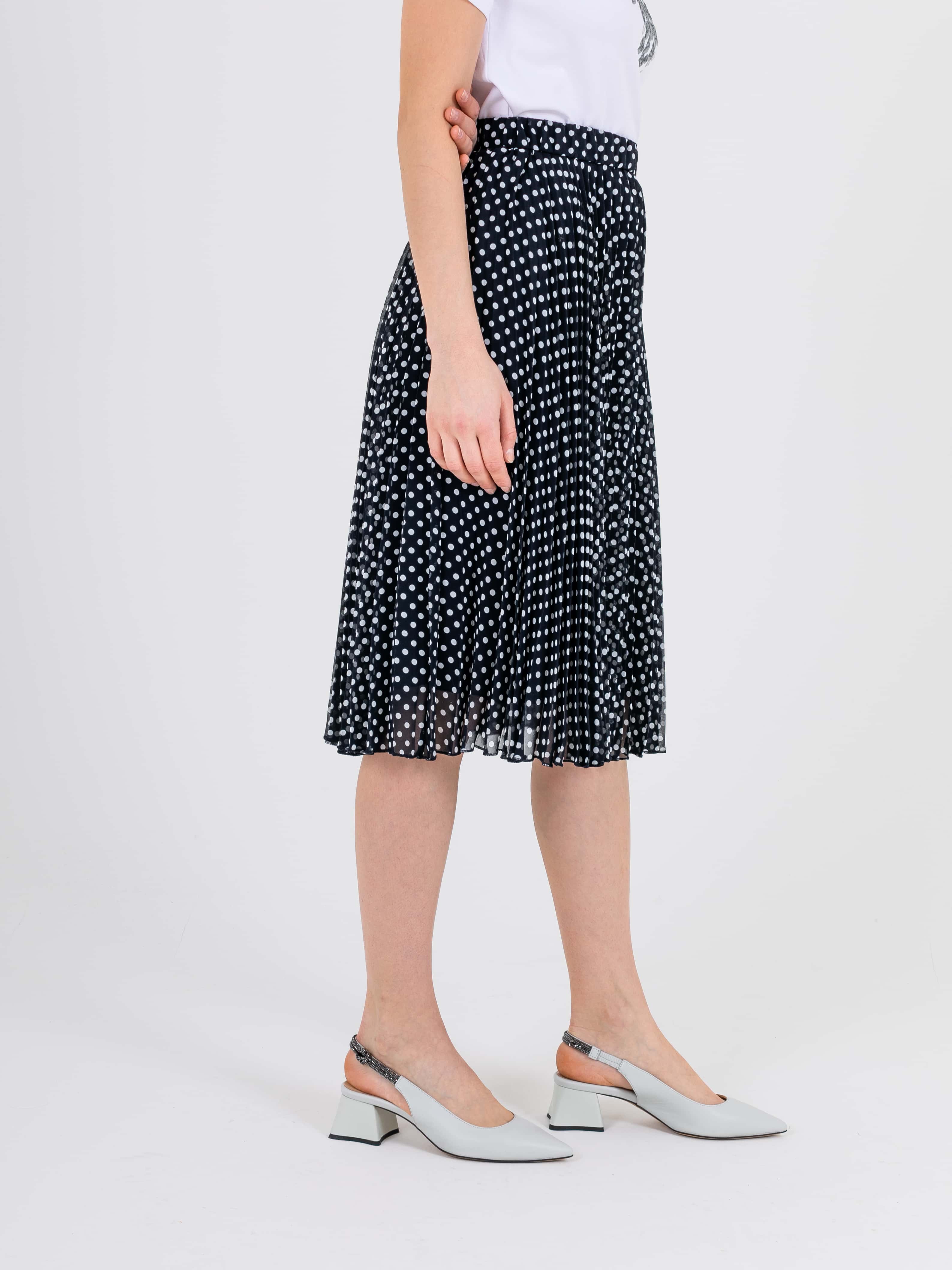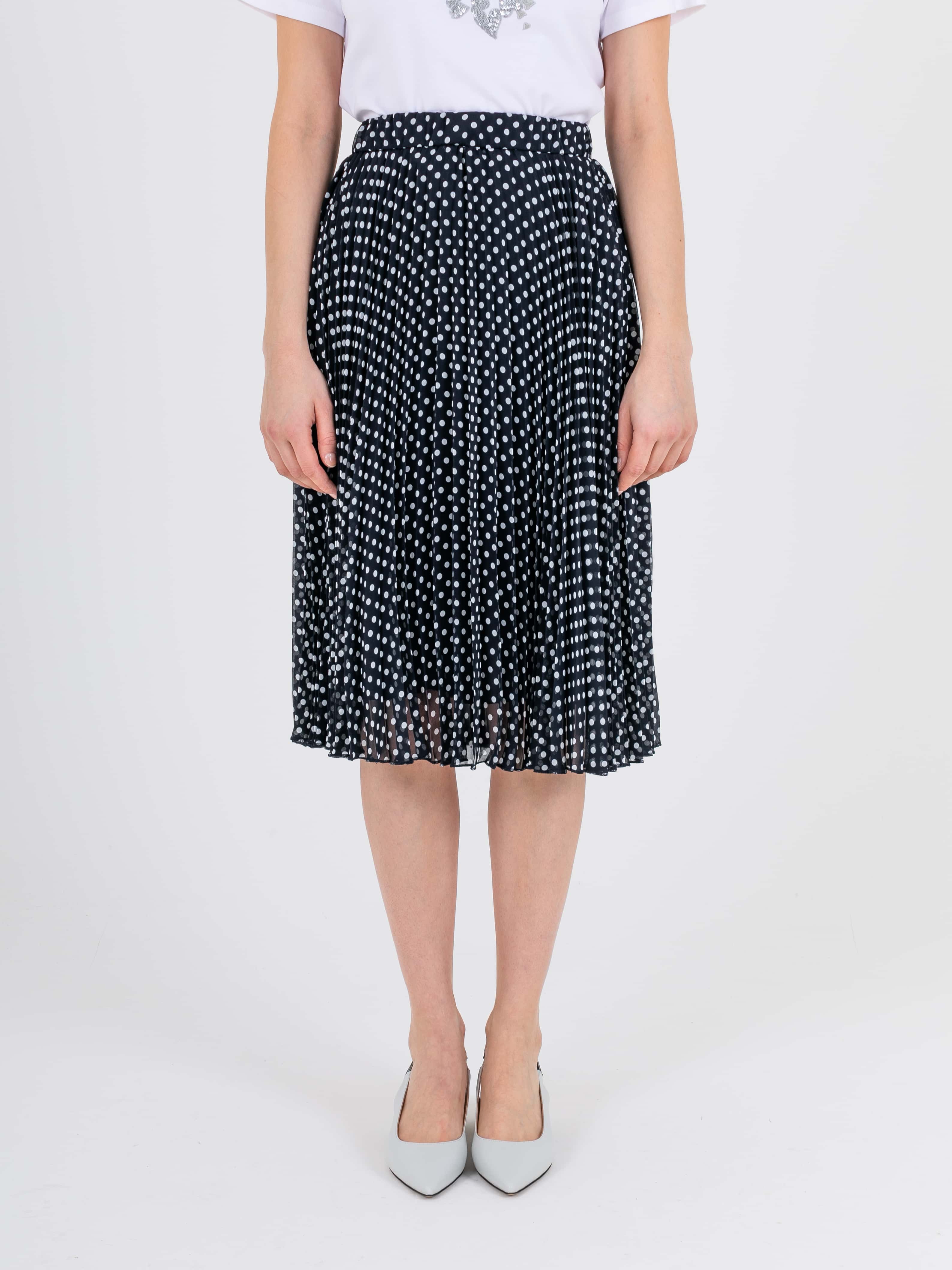 Легкая юбка полусолнце длиной ниже колена, дизайнерская особенность модели – яркий принт «горошек» и плиссировка. Верх юбки обработан поясом на резинке. Юбка на подкладке.