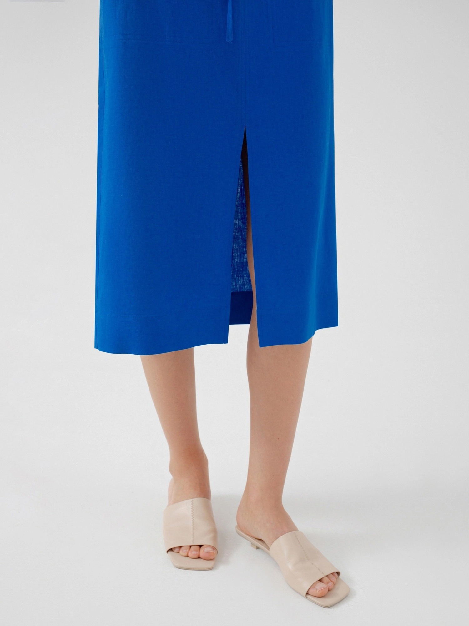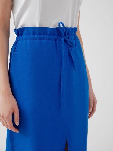 Юбка из ярко-синего хлопка, прямого силуэта, с разрезом по переду и накладными карманами. Пояс юбки на резинке с кулиской.