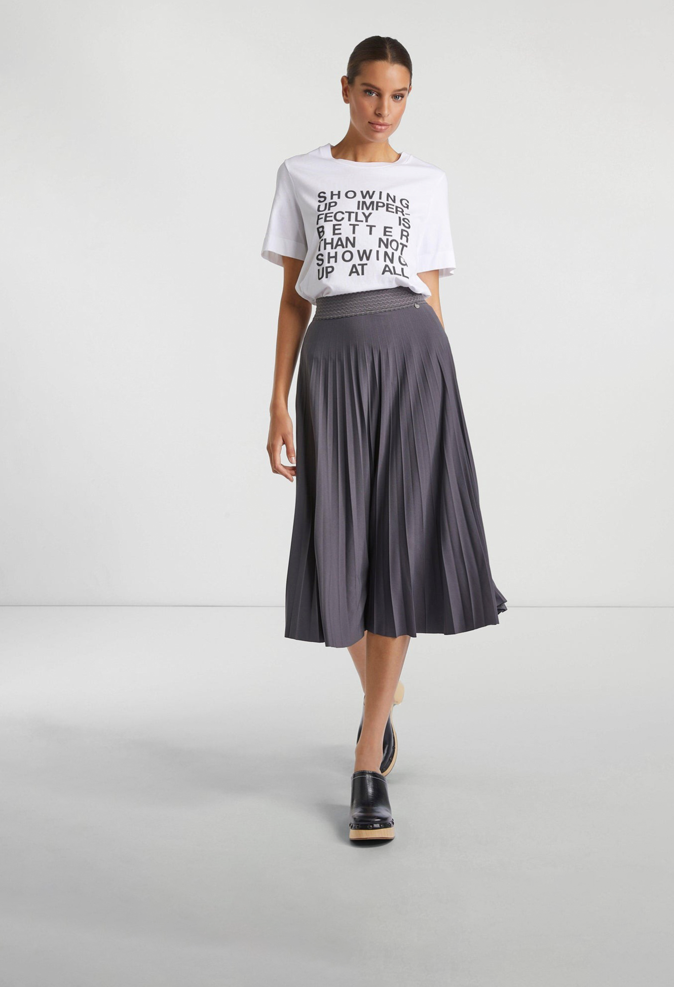 Плиссированная юбка длины миди подчеркнет вашу женственность. Пояс эластичный и впечатляет своим красивым декором, который умело подчеркивает вашу талию.