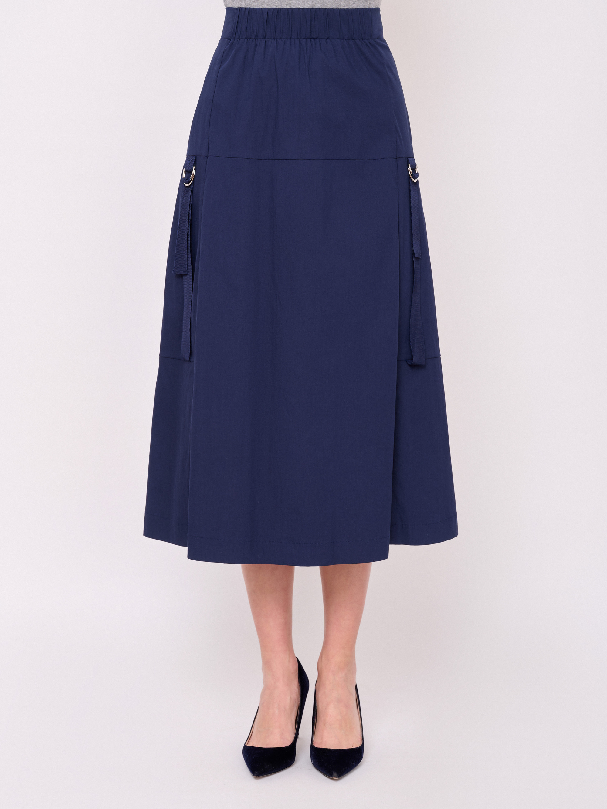 Без застежки, пояс на резинке, покрой расклешенный, посадка средняя, без рисунка, без карманов, конструктивные элементы хлястики, модель юбки расклешенная, длина юбки миди.