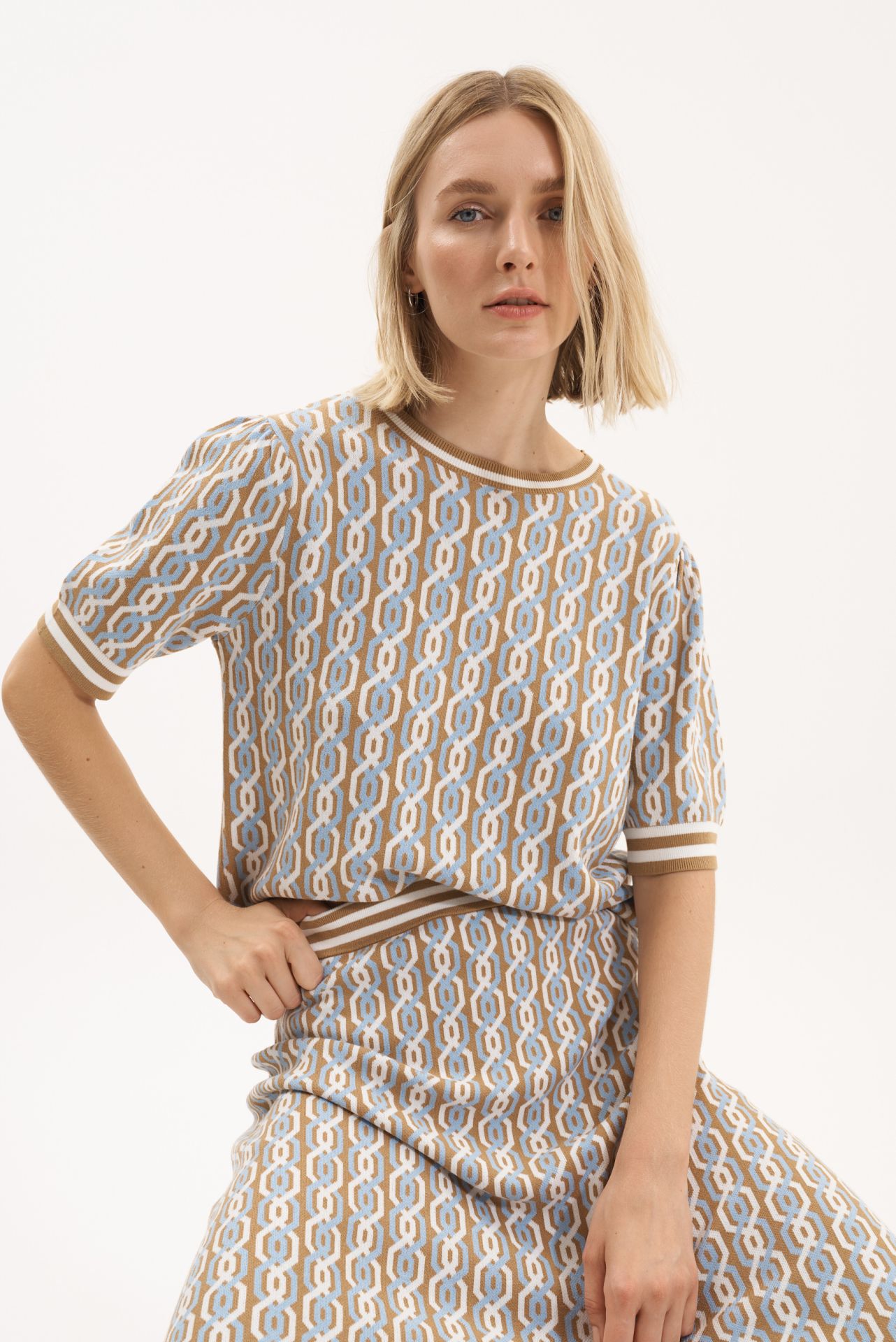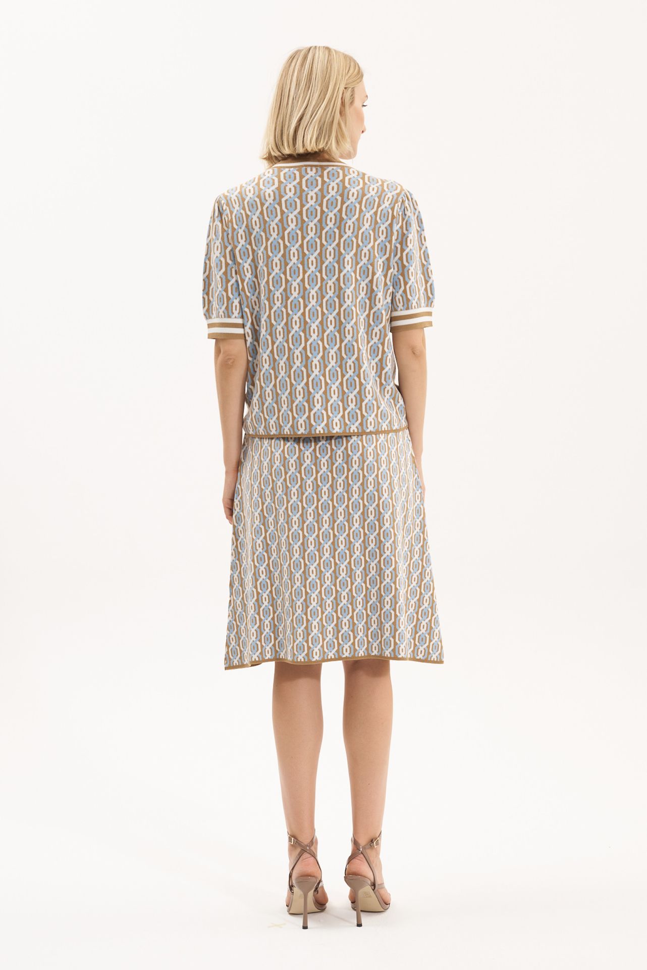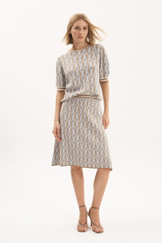 Короткая трикотажная юбка-трапеция с разноцветным узором «шрелья» в медовом/небесно-голубом/белом цветах. Мягкий пояс. Длина: 62 см.
