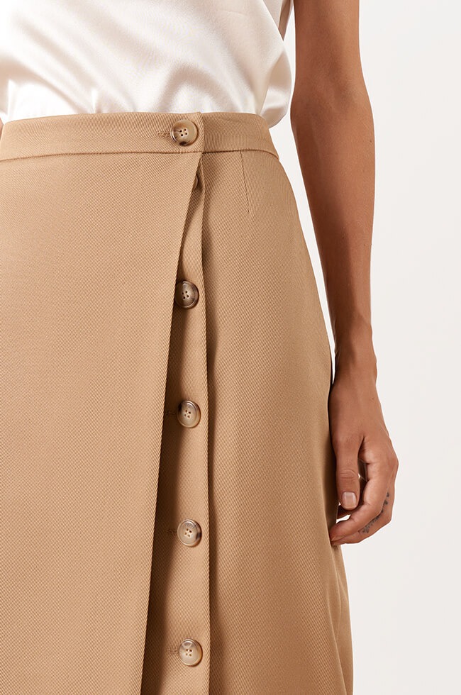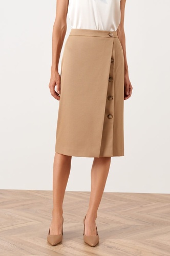 Классическая юбка прямого силуэта, выполнена из костюмного полотна. Притачной пояс с роговой пуговицей. Асимметричная полочка с застежкой на роговые пуговицы. На подкладке.