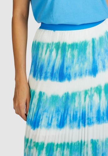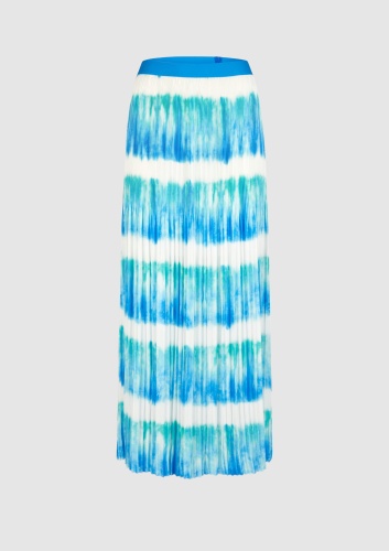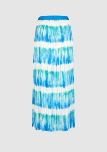 Атласная юбка с принтом батик из небрежно ниспадающего японского атласа имеет удобную эластичную манжету для настоящего комфорта. Вырез узкий сверху и небрежно широкий внизу. Юбка плиссирована сверху и благодаря вискозной подкладке полностью непрозрачна.