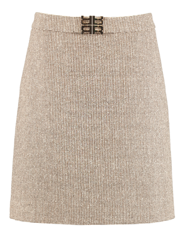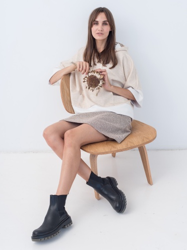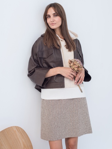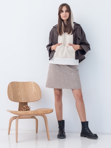 Юбка-трапеция длины миди в бежевом базовом оттенке. Материал из смесового хлопка приятен к телу. Средняя посадка по естественной линии талии.