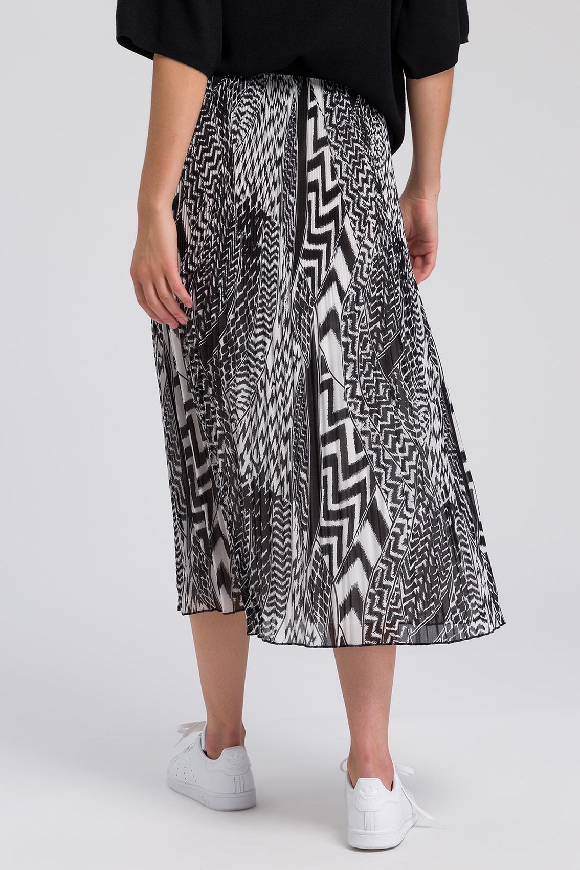 Плиссированная юбка с абстрактным принтом. Трендовая длина миди. Эластичный пояс обеспечивает комфортную посадку. Застежка и карманы отсутствуют.
