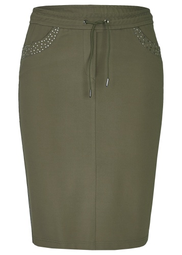 Модная модель в трендовом зеленом цвете! Юбка-карандаш с поясом на кулиске. Отделка стразами придает нотку гламура. Приятный к телу материал из вискозной смеси обеспечивает комфорт.