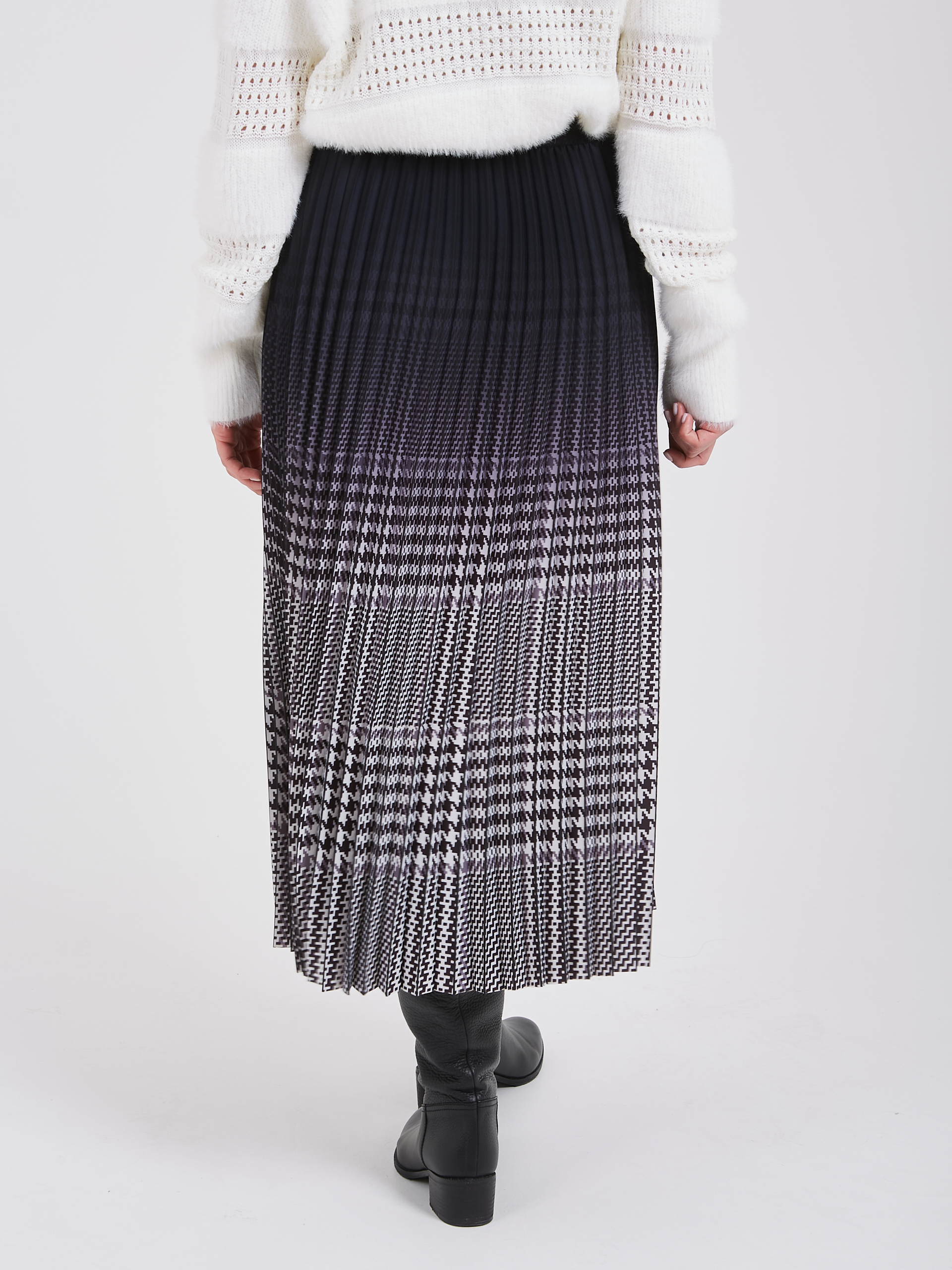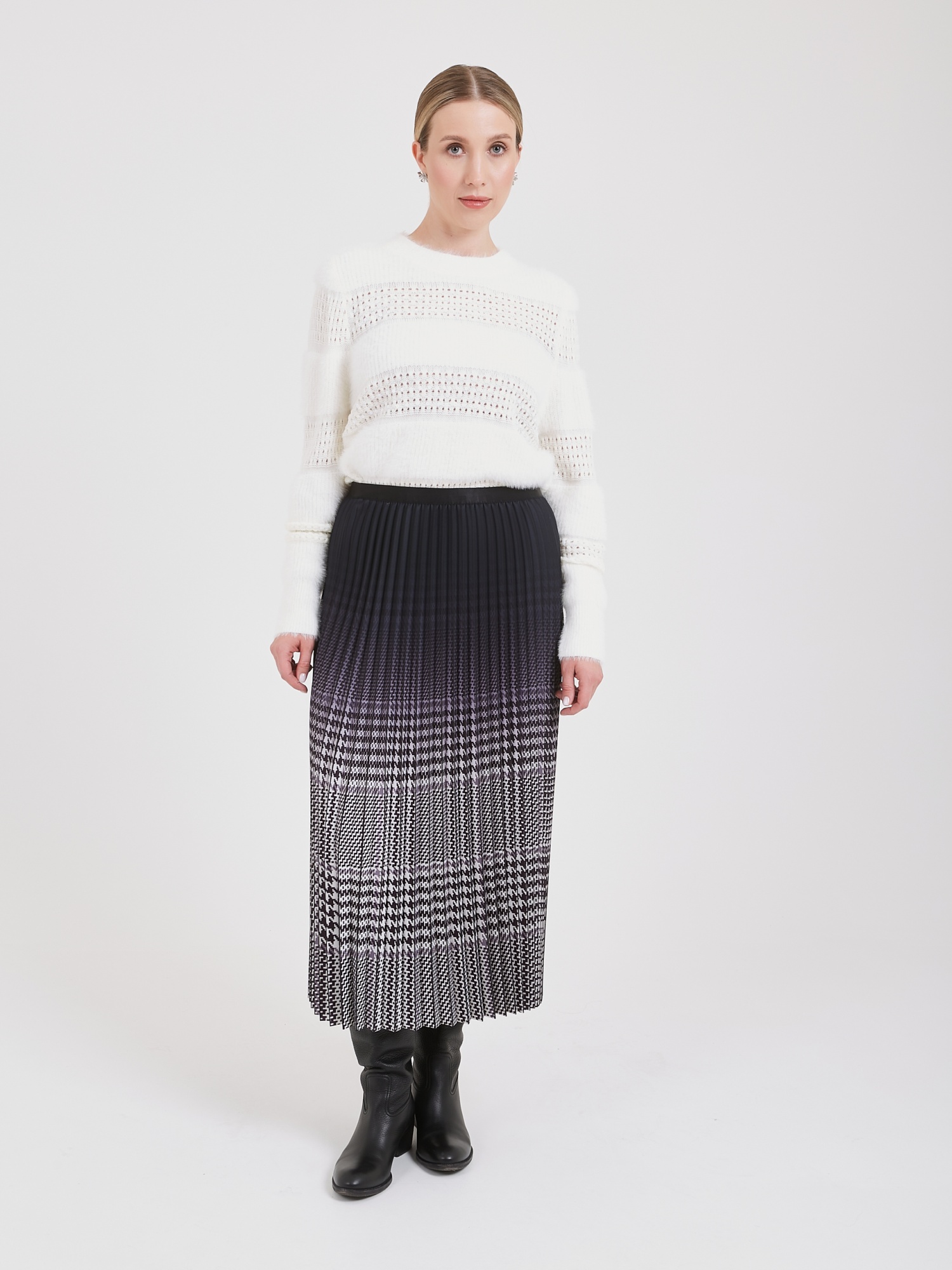 Принт юбки начинается с глубокого чёрного оттенка, плавно переходящего в изысканный узор "гусиная лапка" ближе к низу. Чередующиеся чёрные и белые клетки создают стильный контраст, привлекая внимание. Плиссированная структура добавляет изделию объём и динамику, делая каждый шаг изящным и грациозным.Осень-Зима'25/26. Капсула "Вишневый сад"