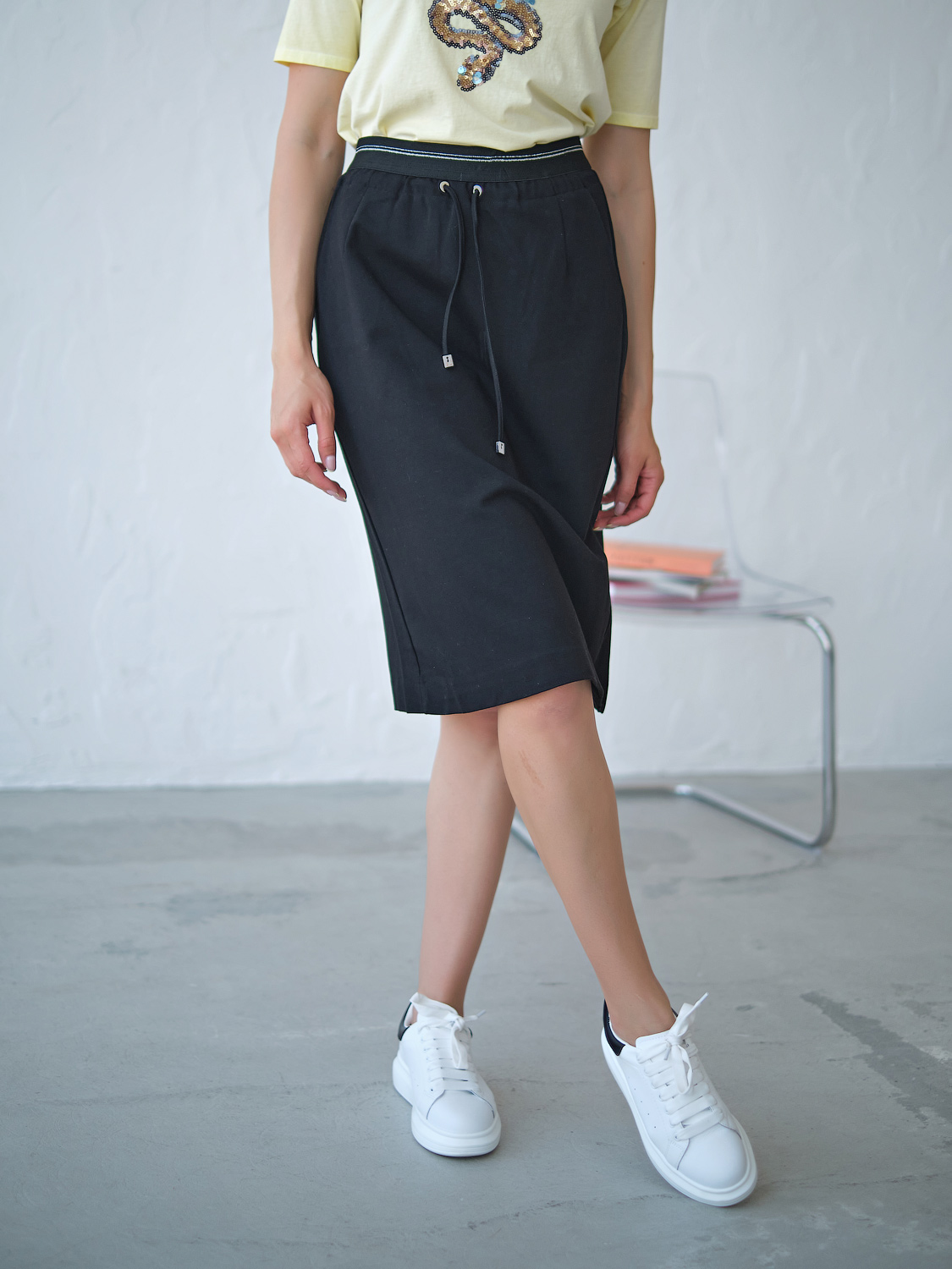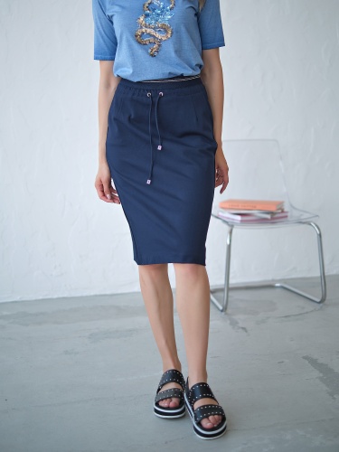 Юбка прямого кроя. Универсальная длина до колена. Прорезные карманы. Шнуровка на талии.
