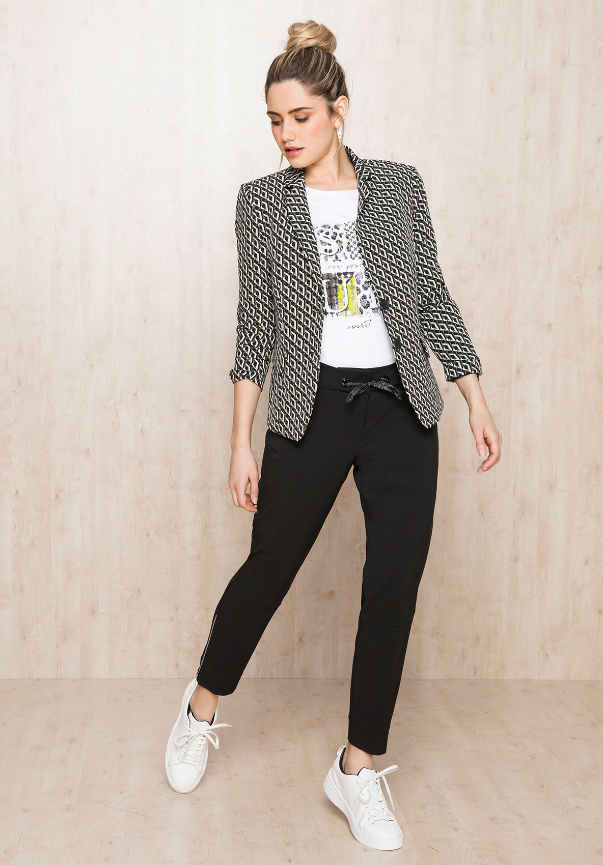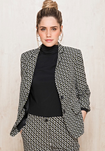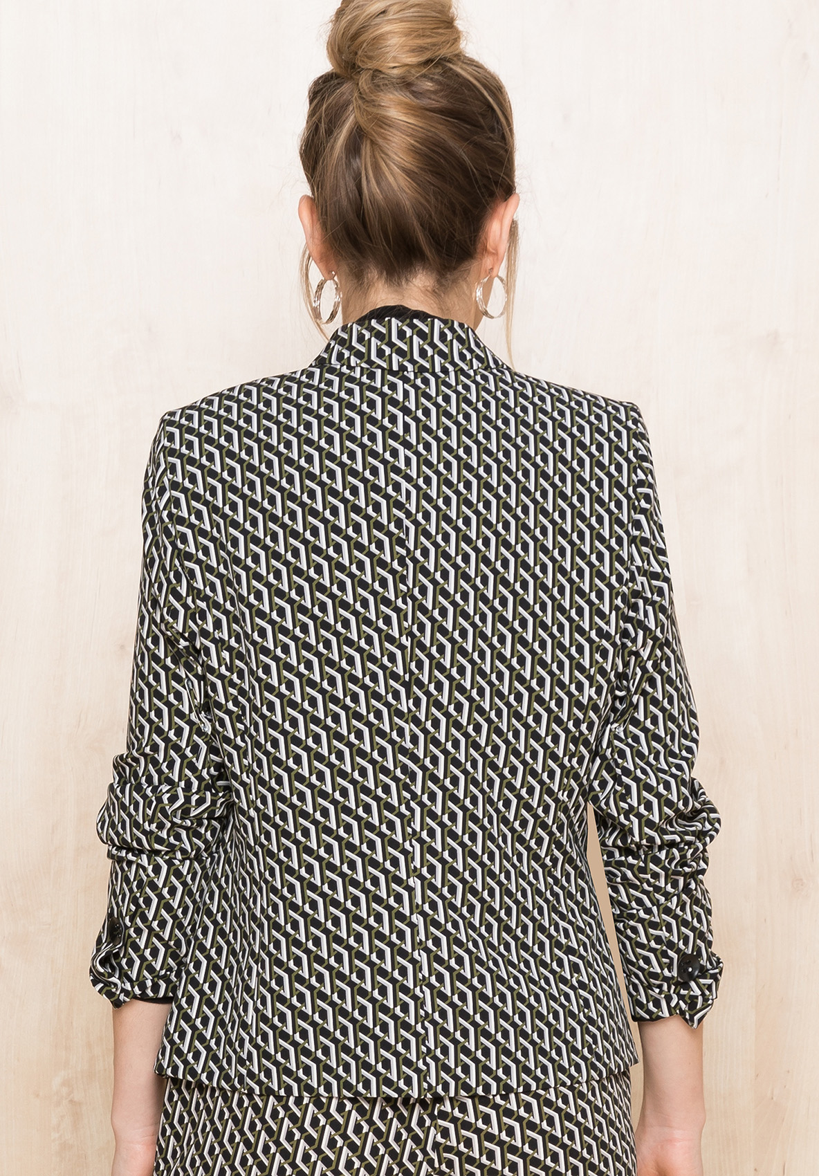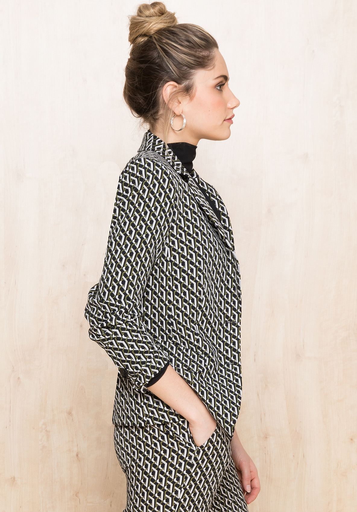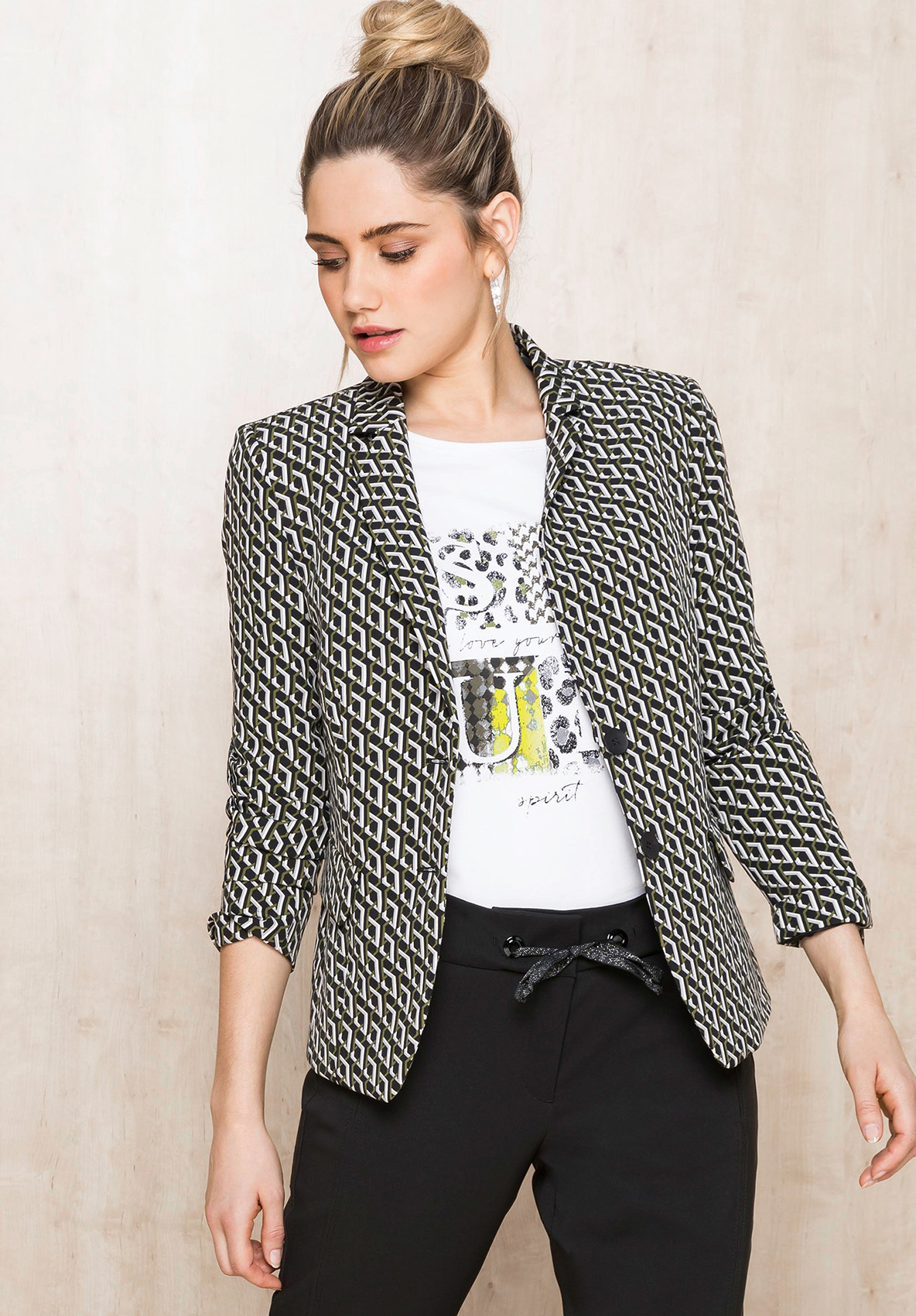 Слегка приталенный жакет с геометрическим принтом привлекает внимание. Черно-белый цвет с серо-зелеными акцентами подчеркивает любой наряд. Завершают образ такие модные акценты, как карманы с клапанами, застежка на пуговицы и стильный воротник с лацканами.