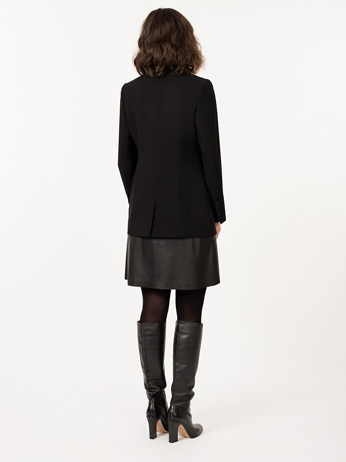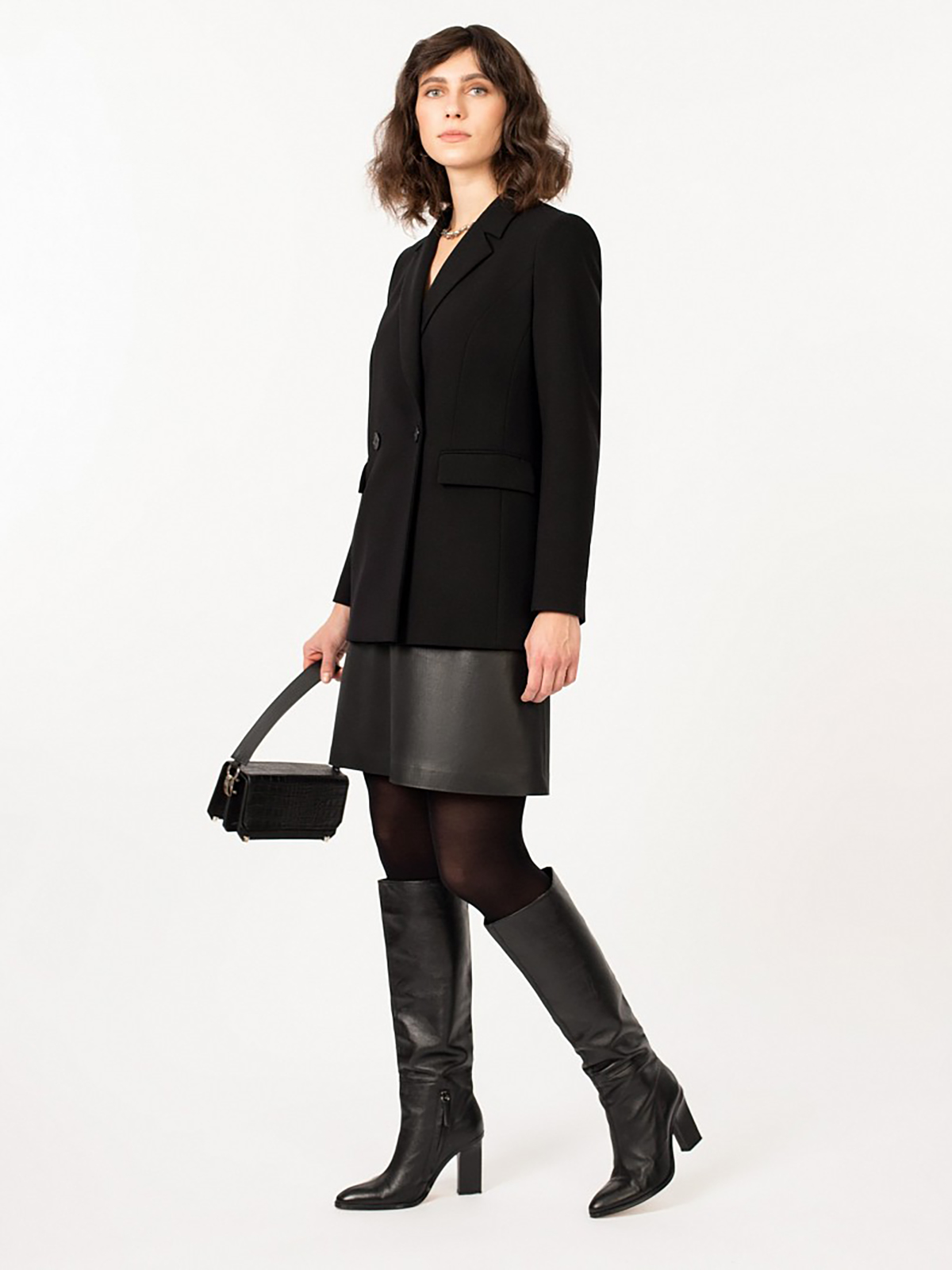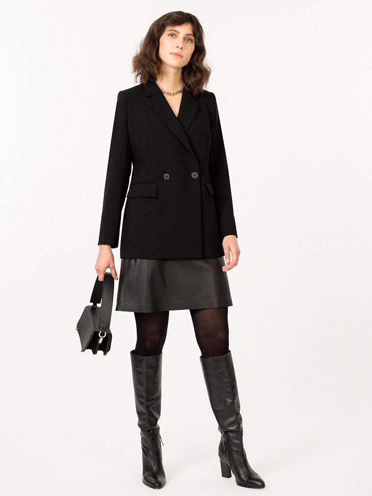 Строгий черный жакет на пуговицах – незаменимая классика для образов в офисном стиле. Отложной воротник с лацканами, втачной рукав полной длины.