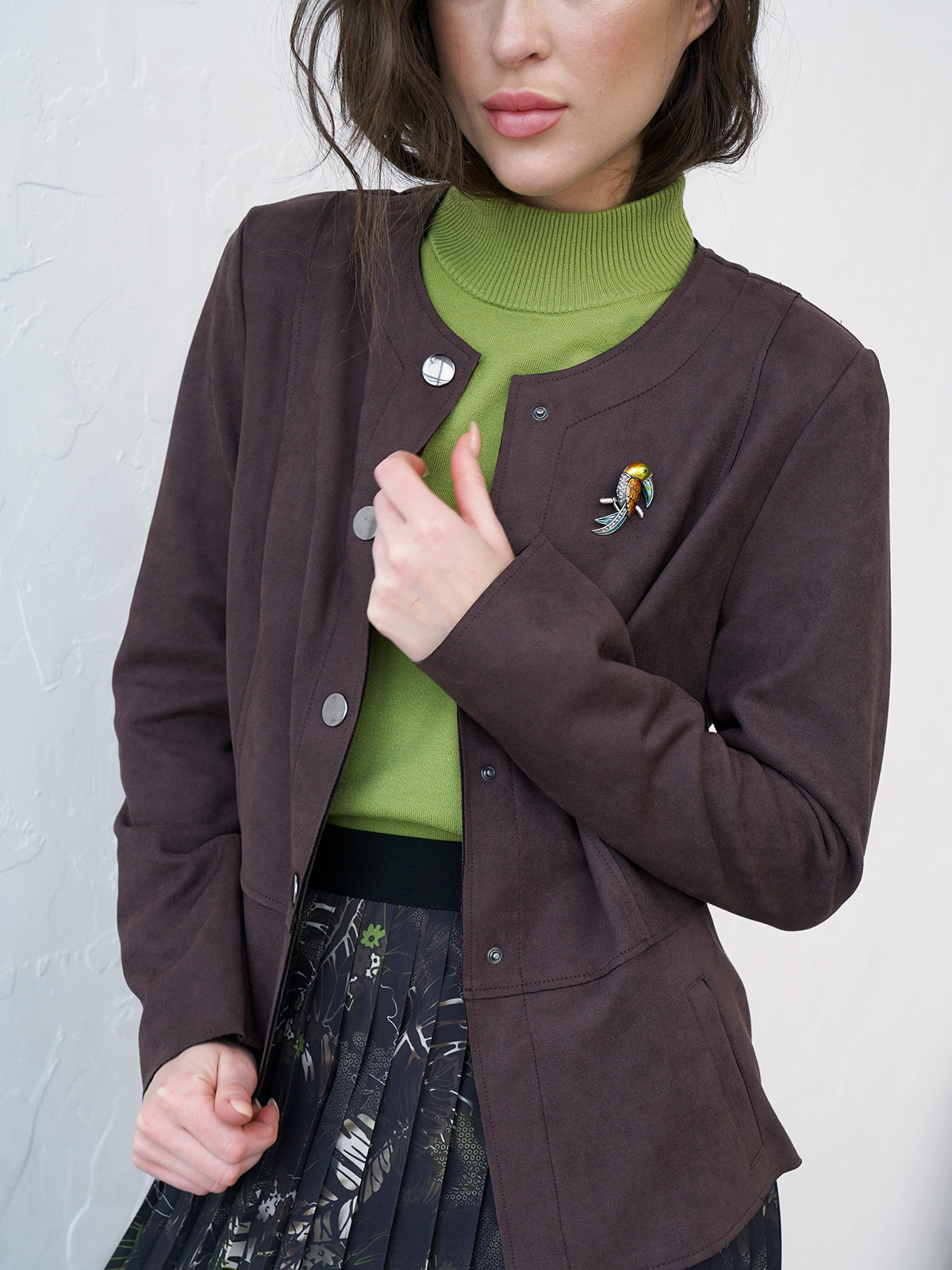 Однотонный жакет насыщенного шоколадного оттенка. Овальный вырез горловины, воротник отсутсвует. Застежка на кнопки, длинный втачной рукав, боковые прорезные карманы с листочкой.